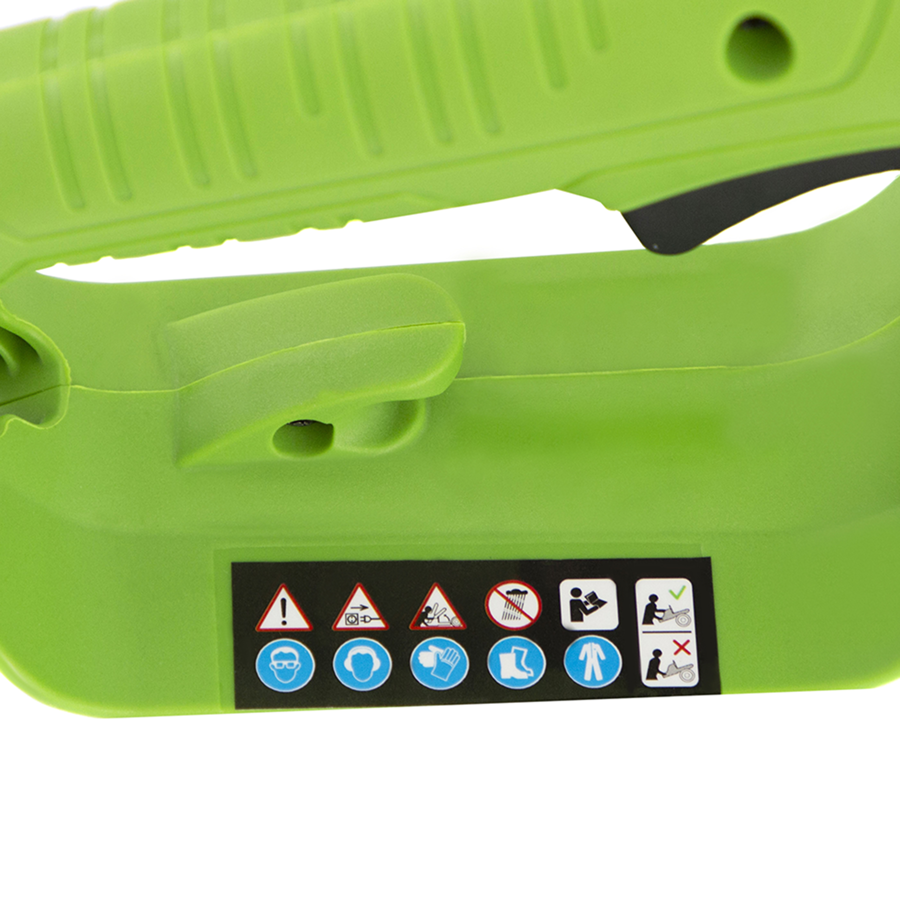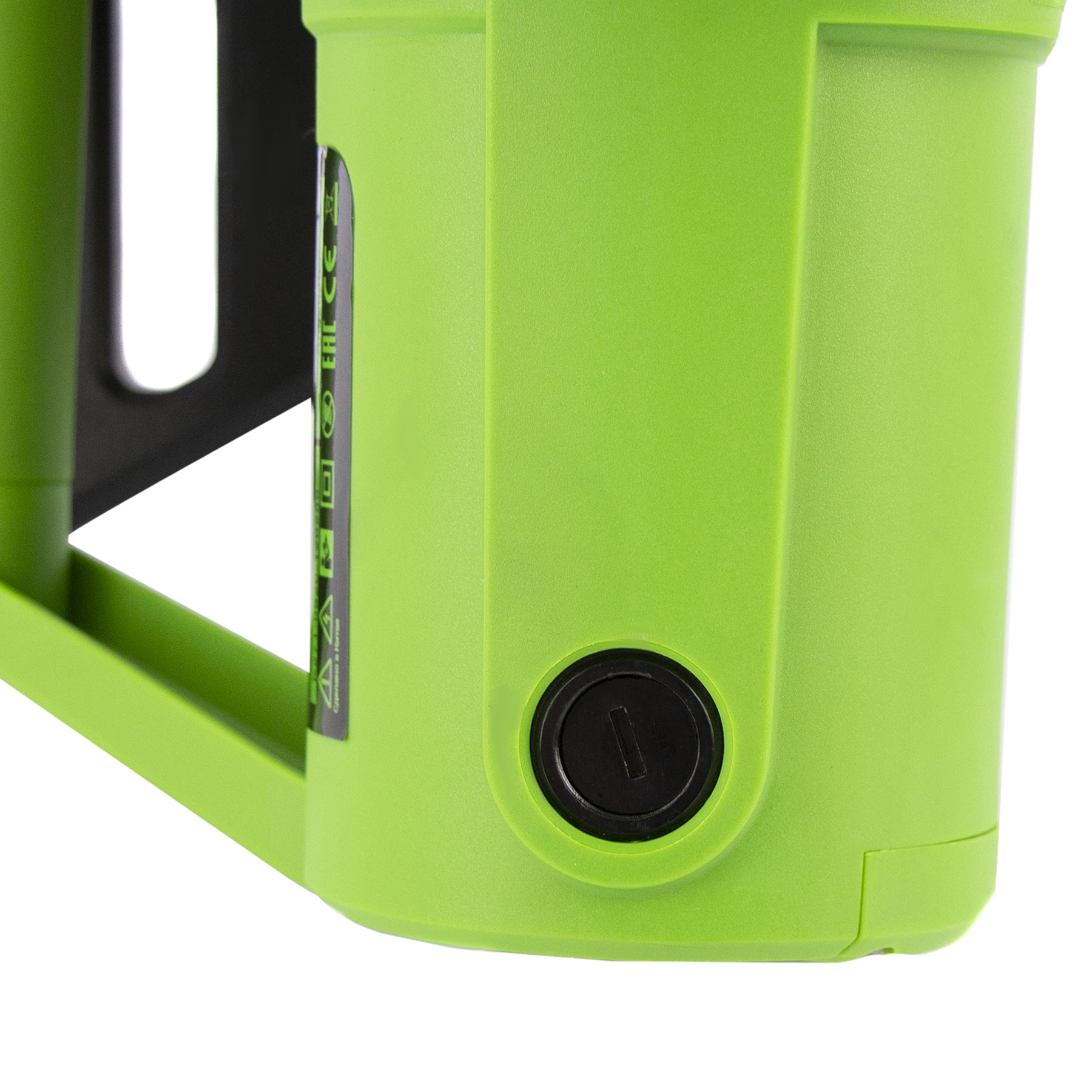 - Защита от случайного пуска — двигатель включается только при одновременном нажатии клавиши блокировки и выключателя.