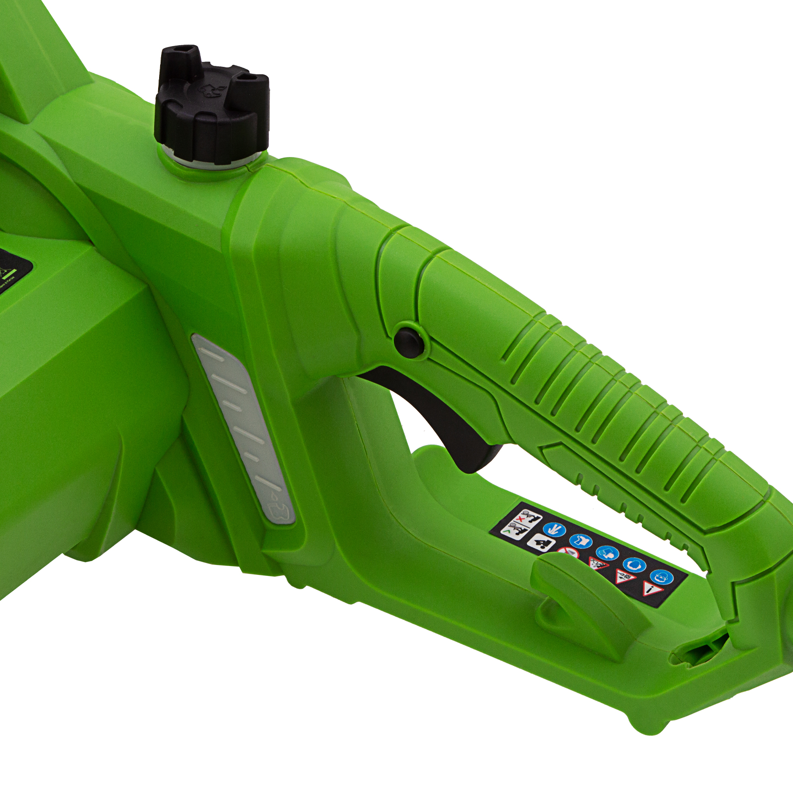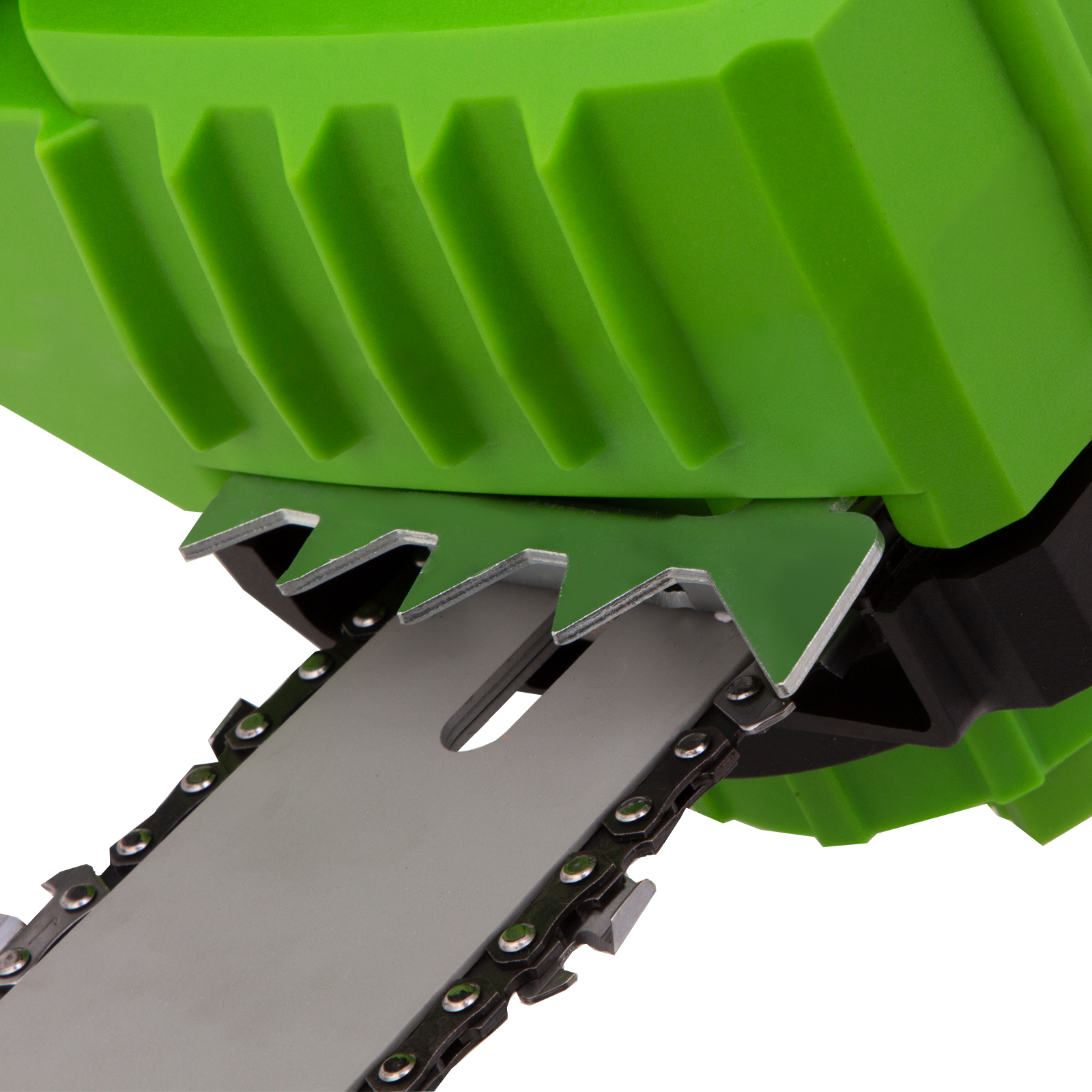 - Бесключевое натяжение цепи — регулировка осуществляется вручную при помощи винта на боковой части корпуса, использование инструментов не требуется.
