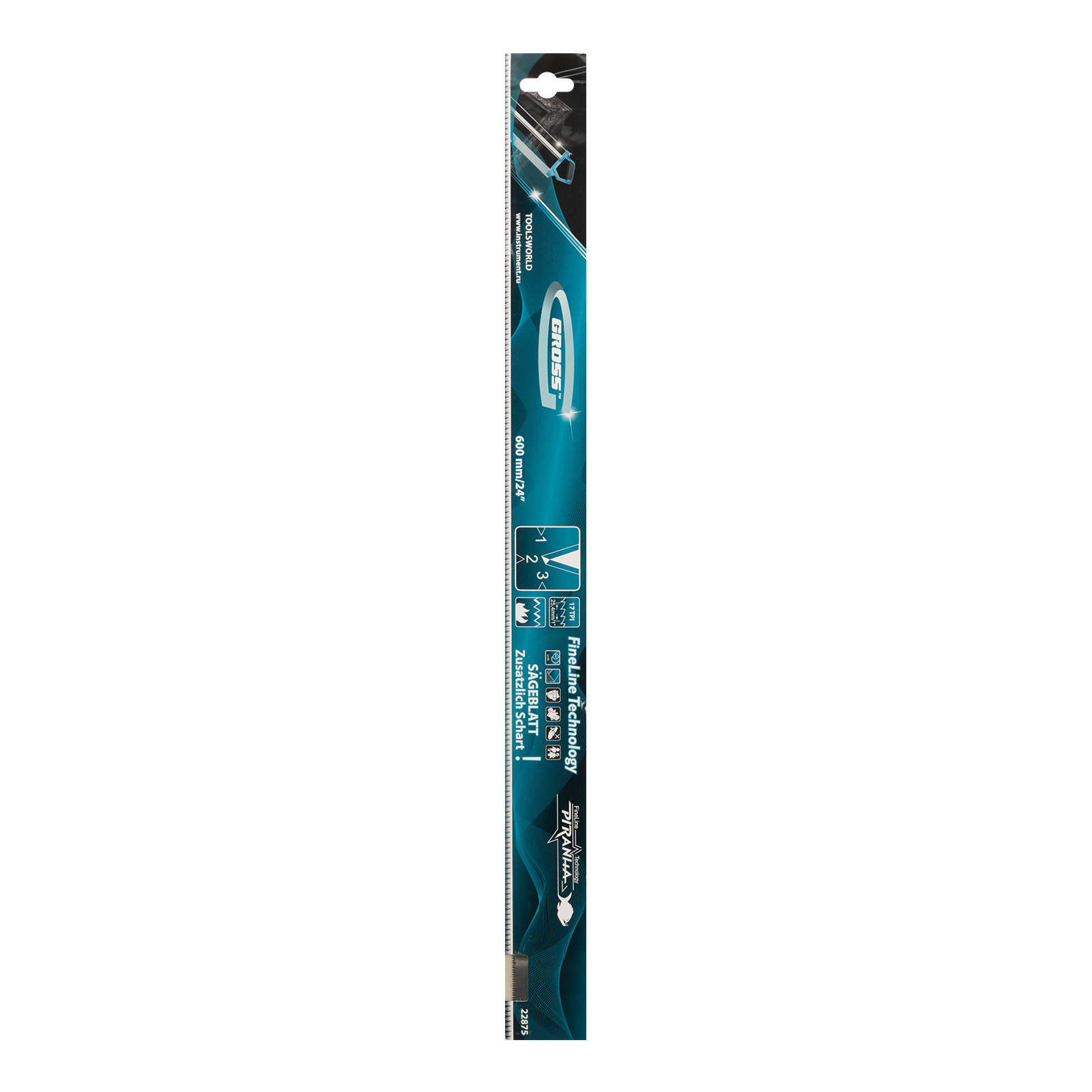 Пильное полотно Gross «PIRANHA» 22875 длиной 600 мм, с каленым зубом с 3D-заточкой, 18 TPI — режущий элемент для прецизионного стусла, применяемый для распила под углом заготовок из дерева, мягкого металла и пластика. Мелкие зубья с шагом 18 TPI позволяют получить точный и чистый рез. Полотно используется для пиления плинтусов, реек, дверных наличников и других деталей.