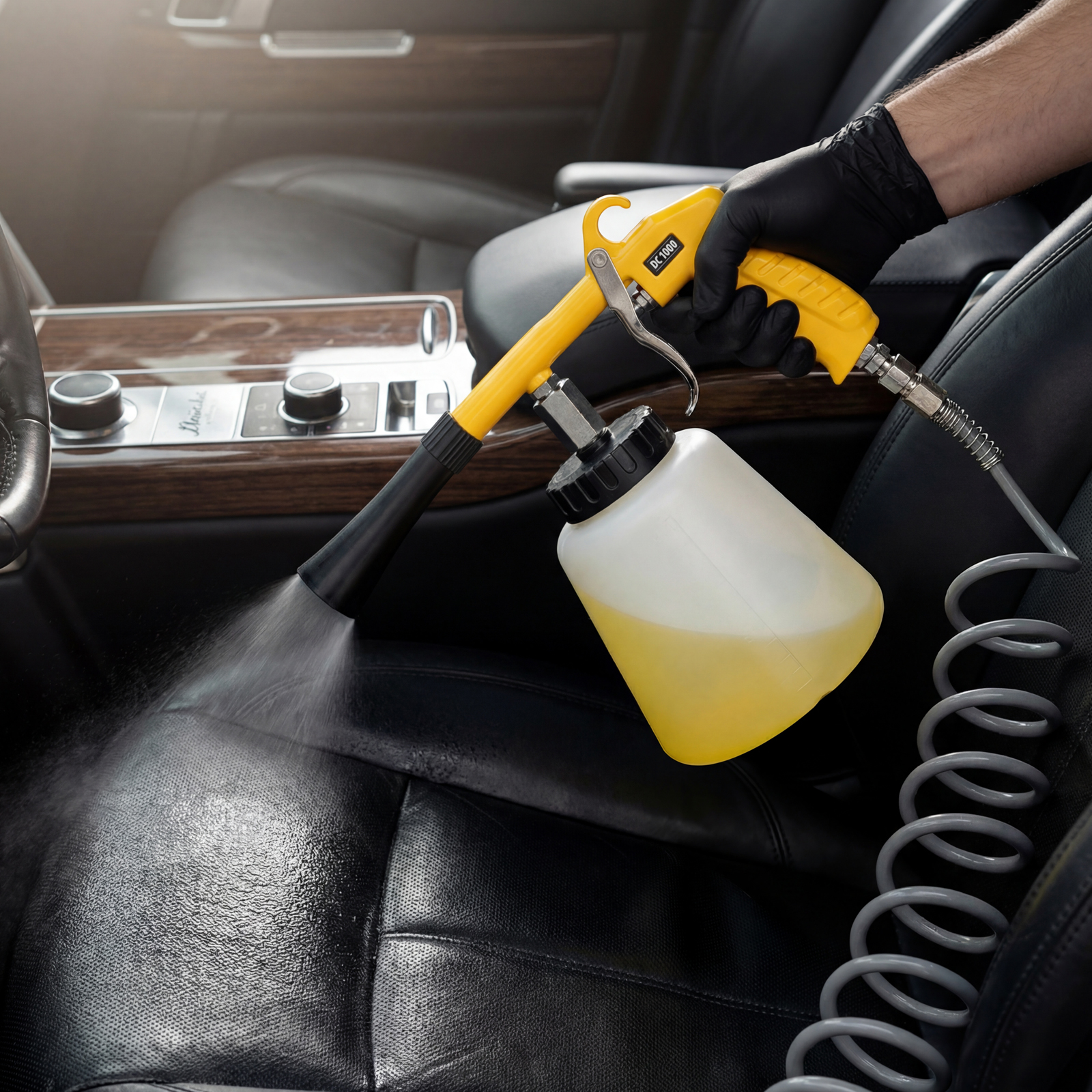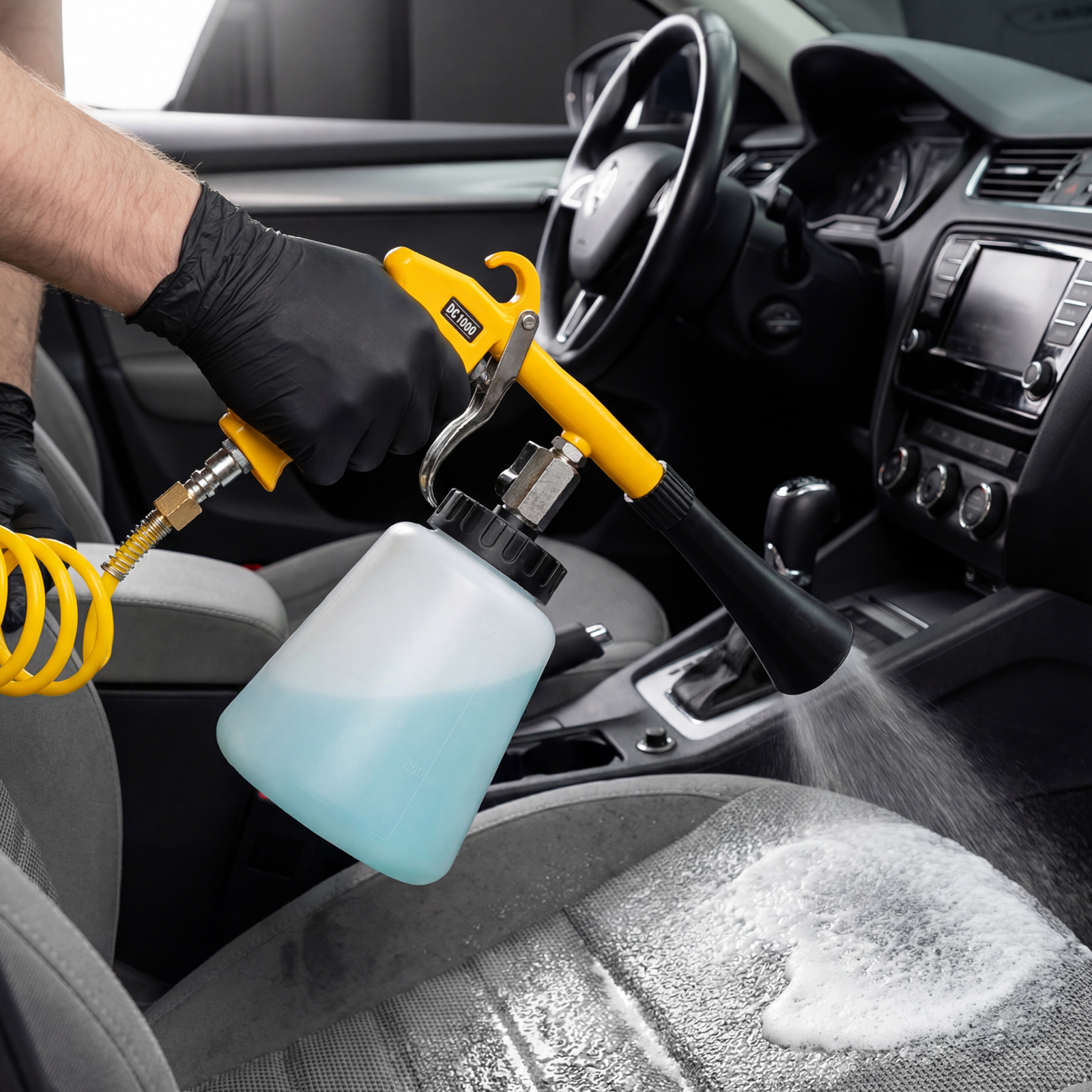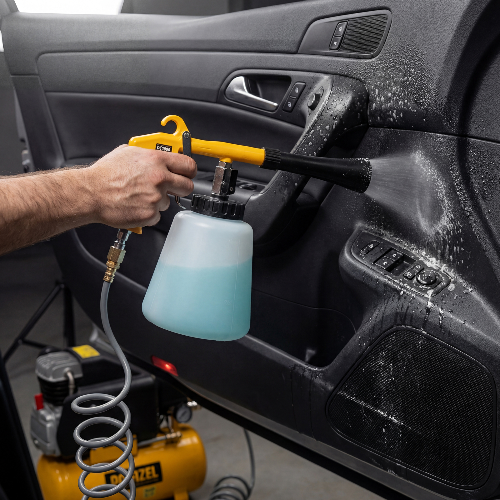 Пневматический пистолет для химчистки Denzel DC1000 57331 предназначен для очищения различных поверхностей: велюра, ткани, пластика, винила и т.д. Поможет удалить загрязнения с обивки сидений в салоне автомобиля, дверных порогов, приборной панели, удобен для обработки труднодоступных мест. Инструмент подходит для сухой и влажной чистки. Частота вращения форсунки составляет 6000 об/мин, что позволяет успешно решать поставленные задачи.