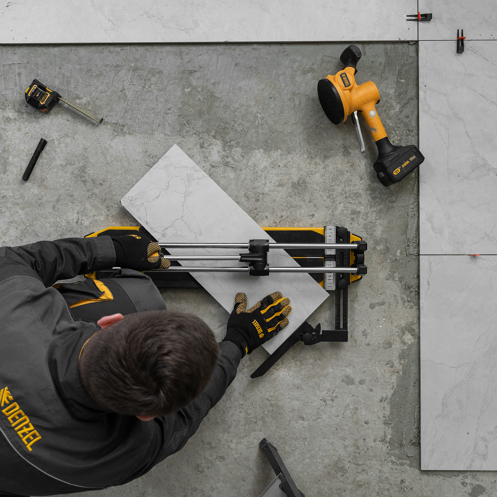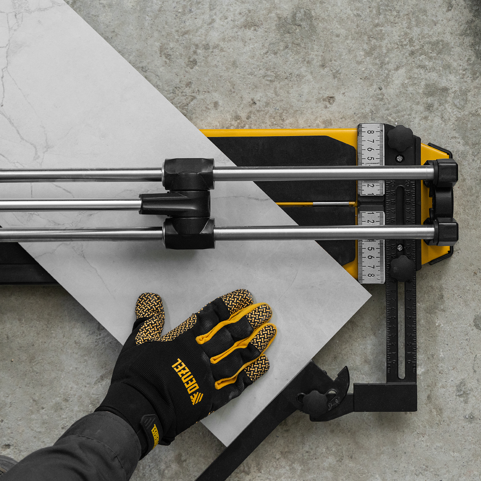 - Удобная работа — благодаря противоскользящим накладкам плиткорез не смещается даже на гладких поверхностях.