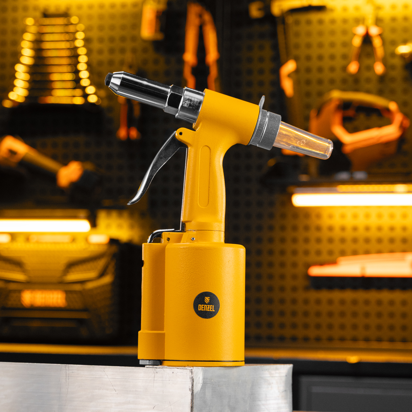 Пневматический заклепочник Denzel PR4 57479 значительно упрощает работу в автосервисах, домашних мастерских, на малых предприятиях и на ремонтных площадках. С его помощью можно без усилий скрепить листовой, профильный и панельный материал из пластика и металла.,Пистолет для вытяжных заклепок работает под давлением 6,3 АТМ и расходует всего 85 литров воздуха в минуту, поэтому для него подойдет компрессор средней мощности. В качестве оснастки используются заклепки размером 2,4-4,8 мм. В комплект поставки входит 4 насадки под заклепки размерами 2,4 мм, 3,2 мм, 4 мм и 4,8 мм.