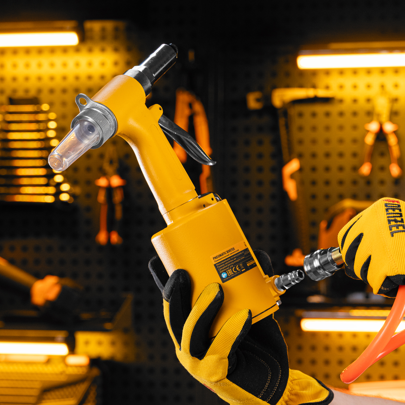 - Небольшой вес — пневмозаклепочник PR 4 весит всего 1,4 кг и не оказывает сильной нагрузки на руки, что особенно важно при длительных работах.