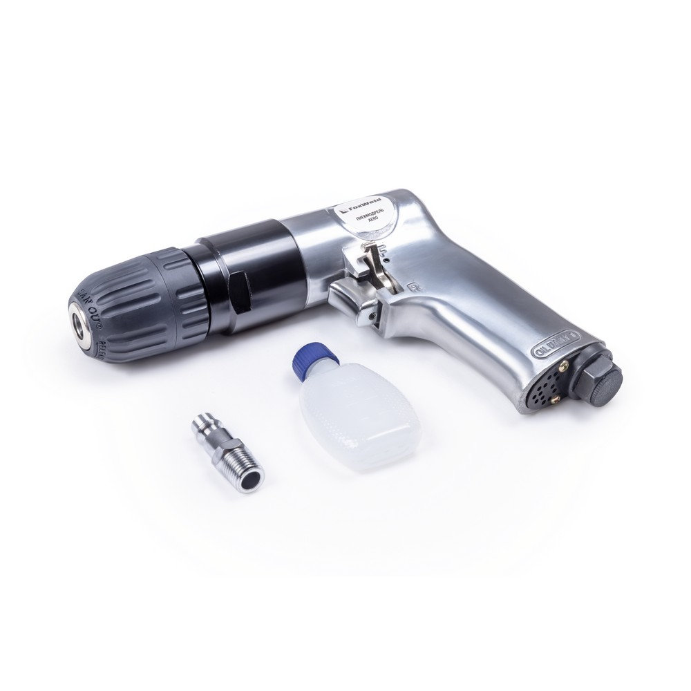 Пневматическая дрель AERO с бесключевым патроном 10 мм, предназначена для сверления отверстий в дереве, металле и пластике, а так же, завинчивания и отвинчивания винтов и шурупов с резьбой. Для этих задач предусмотрен режим реверса. Подключается к магистрали воздушного компрессора с помощью быстросъемного соединения 1/4" М - Rapid M. Имеет легкий вес и малые размеры для удобства работы. Крепкий алюминиевый корпус гарантирует надежность инструмента. Перед первым применением пожалуйста прочтите инструкцию по эксплуатации.