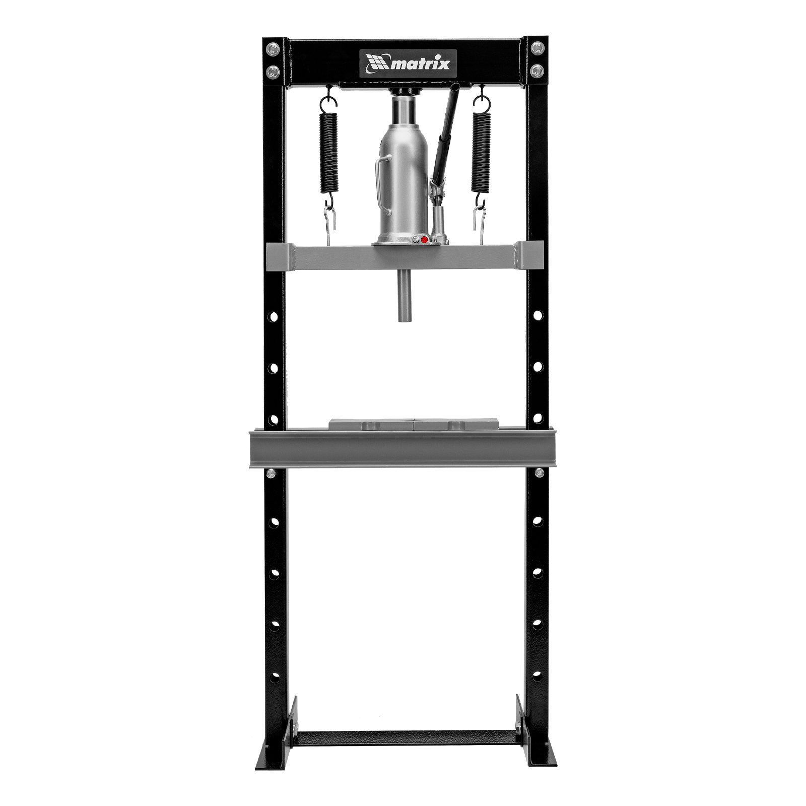 Гидравлический пресс Matrix 523105 размером 1360 х 500 х 510 мм, воздействующий на детали с усилием 12 т, поставляется комплектом из 2 частей. Используется для запрессовки и выпрессовки различных деталей, необходимых для ремонта автомобилей. Изготовлен из толстого прочного металла и имеет простую разборную конструкцию из верхней и нижней балок, стоек, станин и гидравлического бутылочного домкрата. Пресс подойдет для самостоятельного использования в гараже.