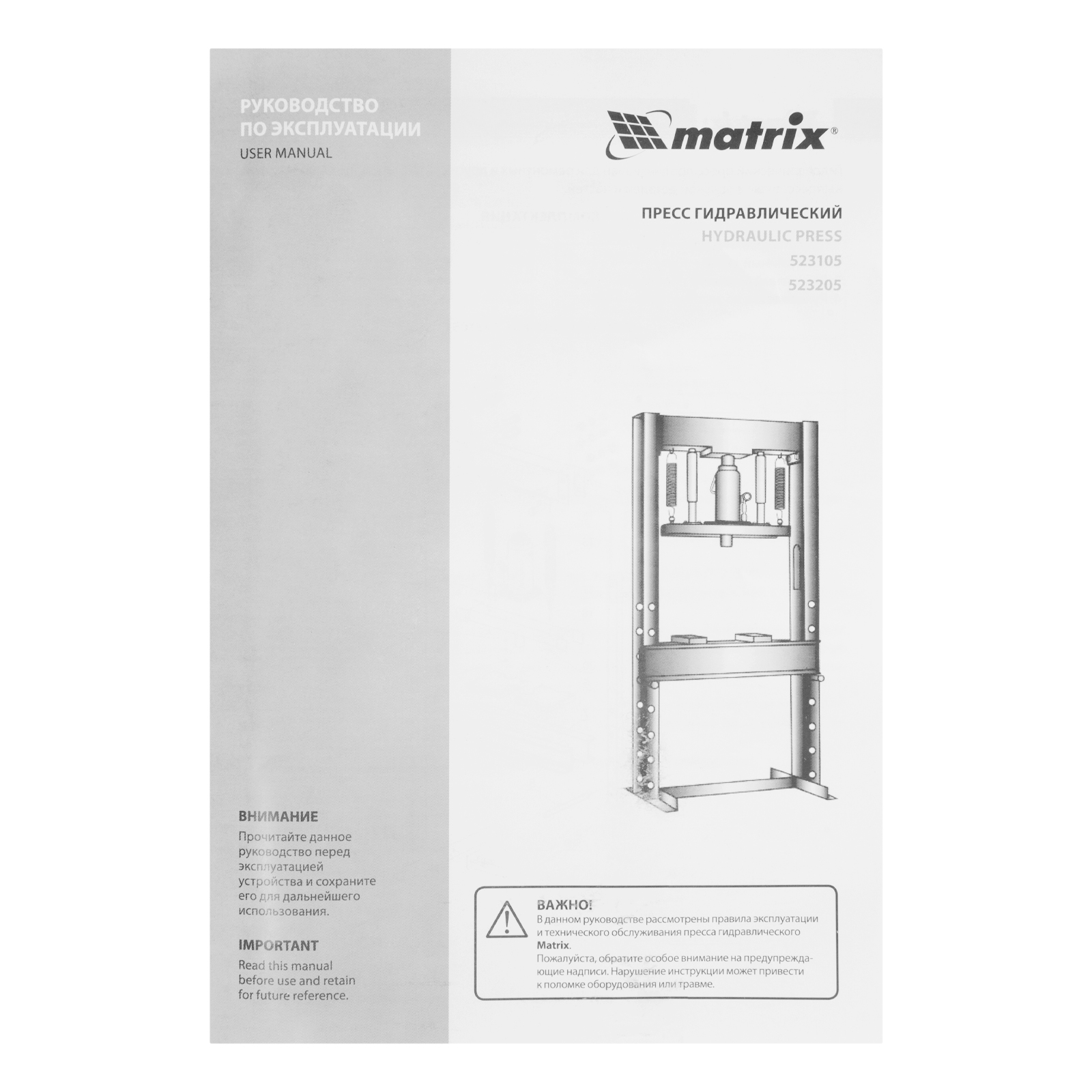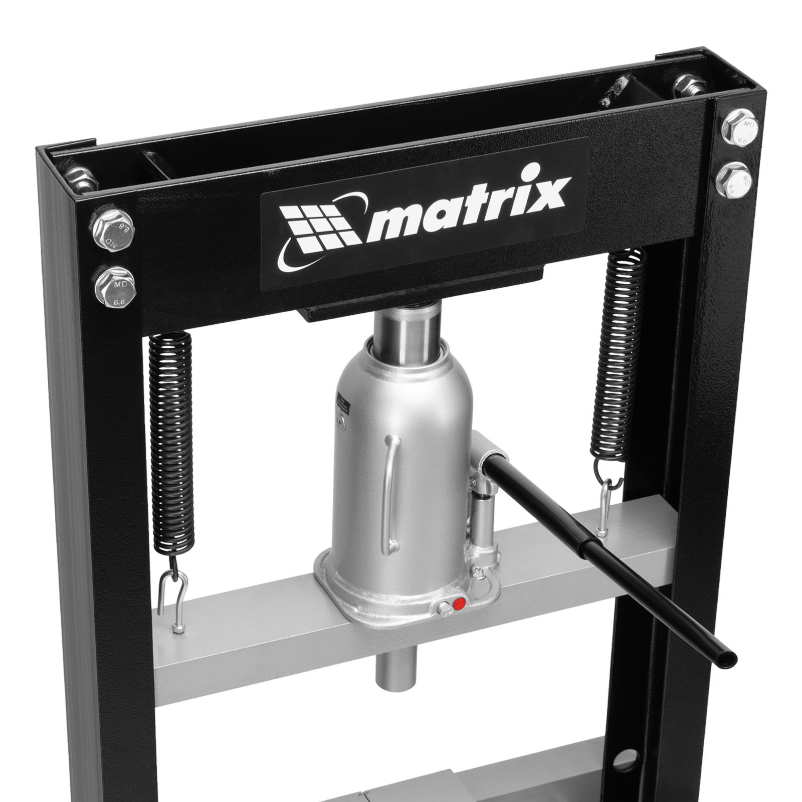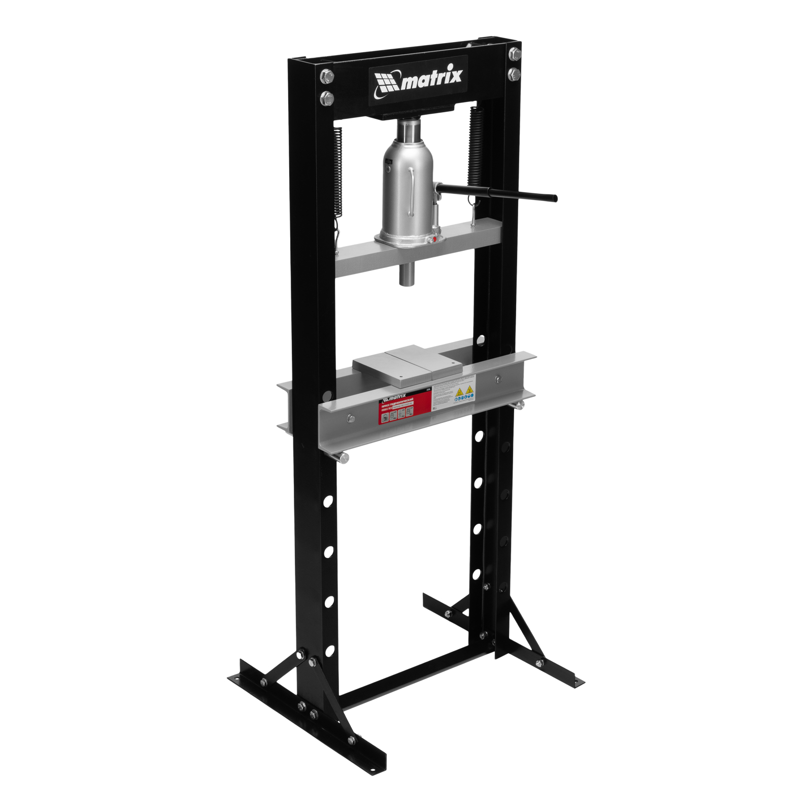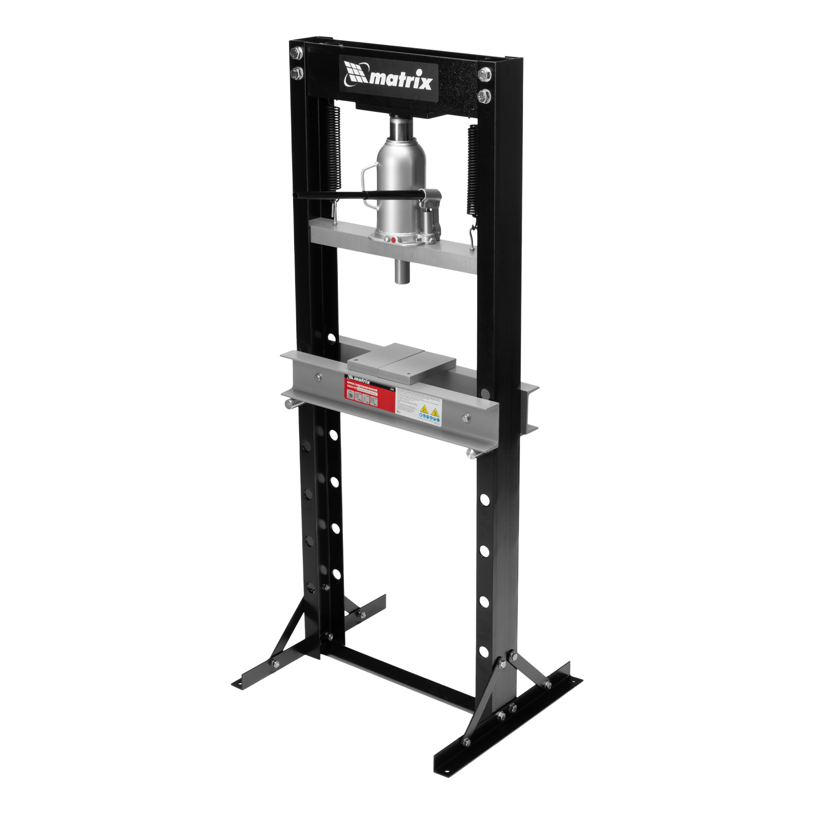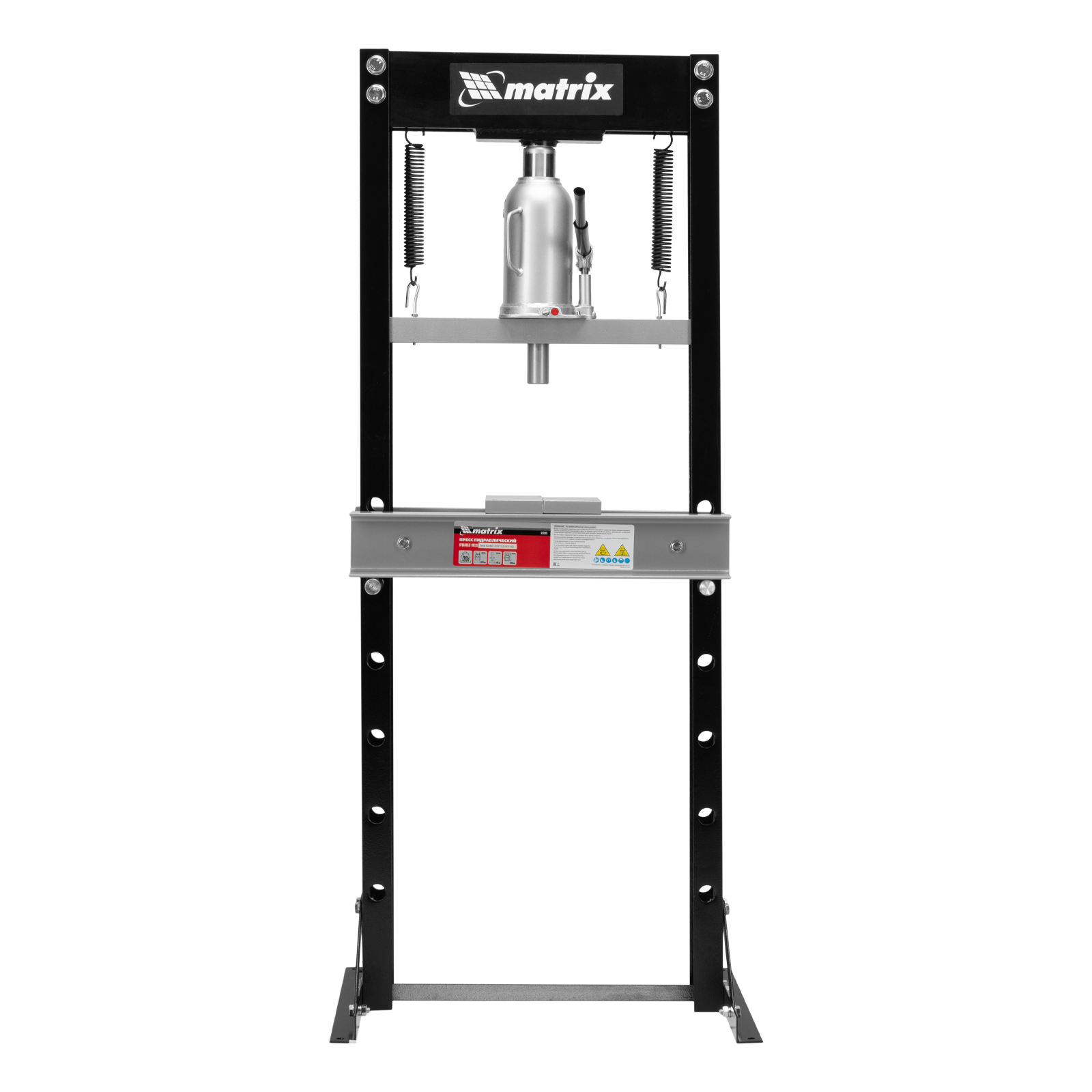 Гидравлический пресс Matrix 523205 размером 640 х 540 х 1500 мм, воздействующий на детали с усилием 20 т, поставляется комплектом из 2 частей. Используется для запрессовки и выпрессовки различных деталей, необходимых для ремонта автомобилей. Изготовлен из толстого прочного металла и имеет простую разборную конструкцию из верхней и нижней балок, стоек, станин и гидравлического бутылочного домкрата. Пресс подойдет для самостоятельного использования в гараже.