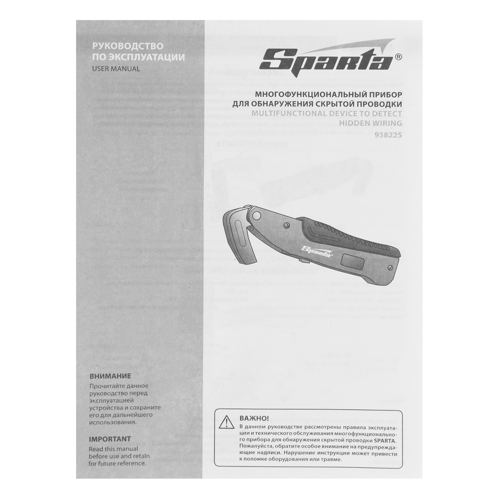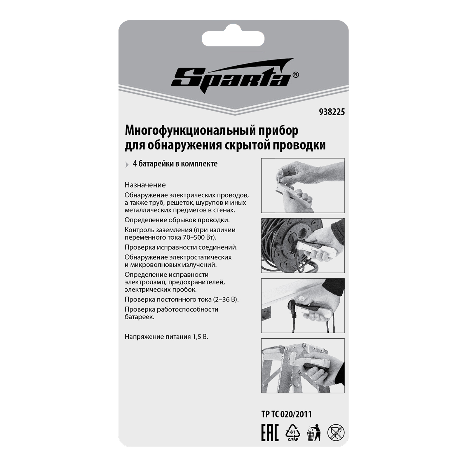 Прибор Sparta 938225 используется для обнаружения скрытой проводки и предметов из металла: труб, решеток, крепежных элементов и т.д. Он пригодится мастерам при сверлении стен, установке розеток, прокладке коммуникаций и других ремонтных работах. Также с его помощью можно определить исправность проводки, приборов, полярность батареек, осуществить контроль заземления и проверить наличие микроволновых и электростатических излучений.