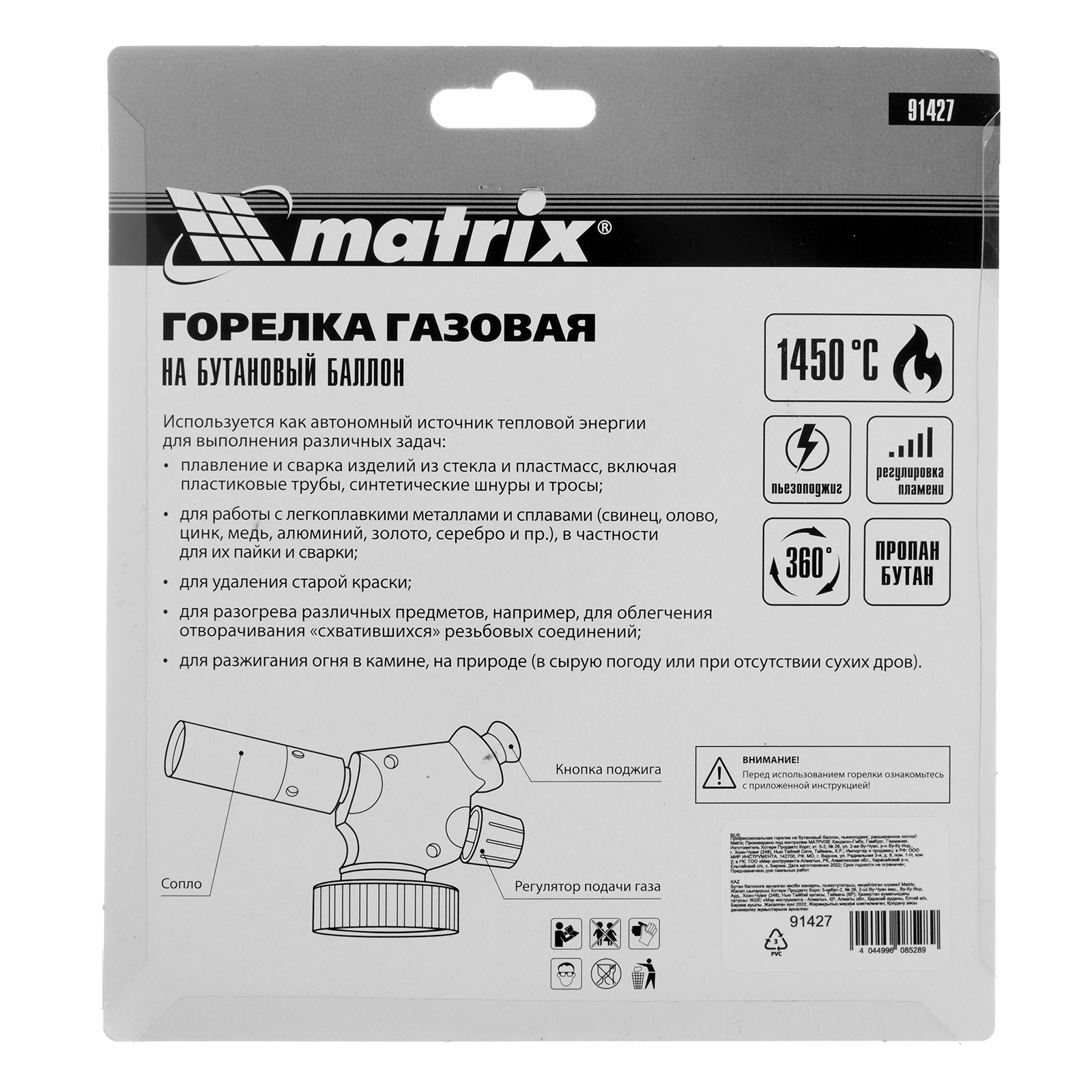 Горелка на бутановый баллон Matrix 91427 с пьезоподжигом предназначена для профессионального использования и применяется для нагрева и пайки деталей. Температура пламени достигает 1450 °С, что позволяет эффективно решать поставленные задачи. Горелка будет полезна в автомастерской, а также дома, на даче или в походе.
