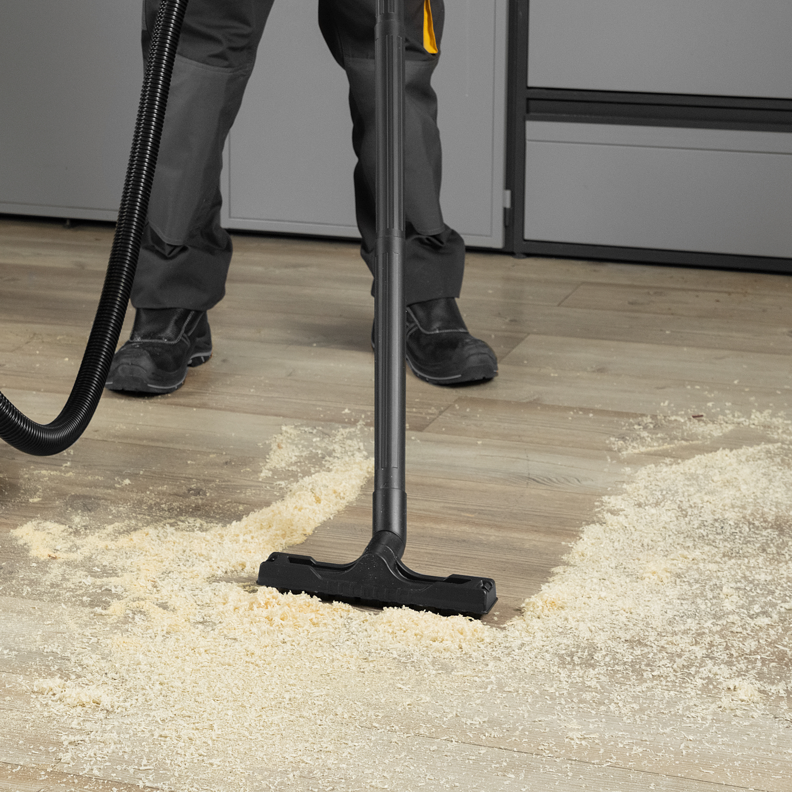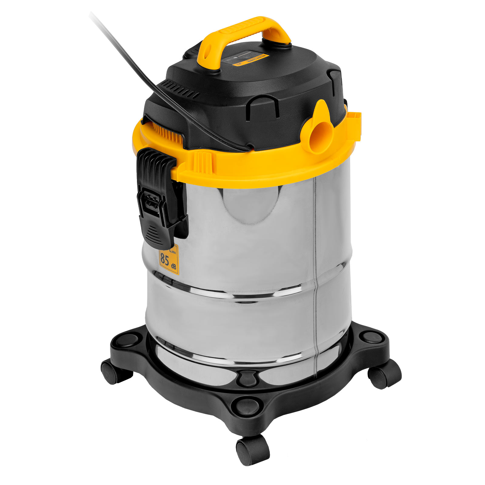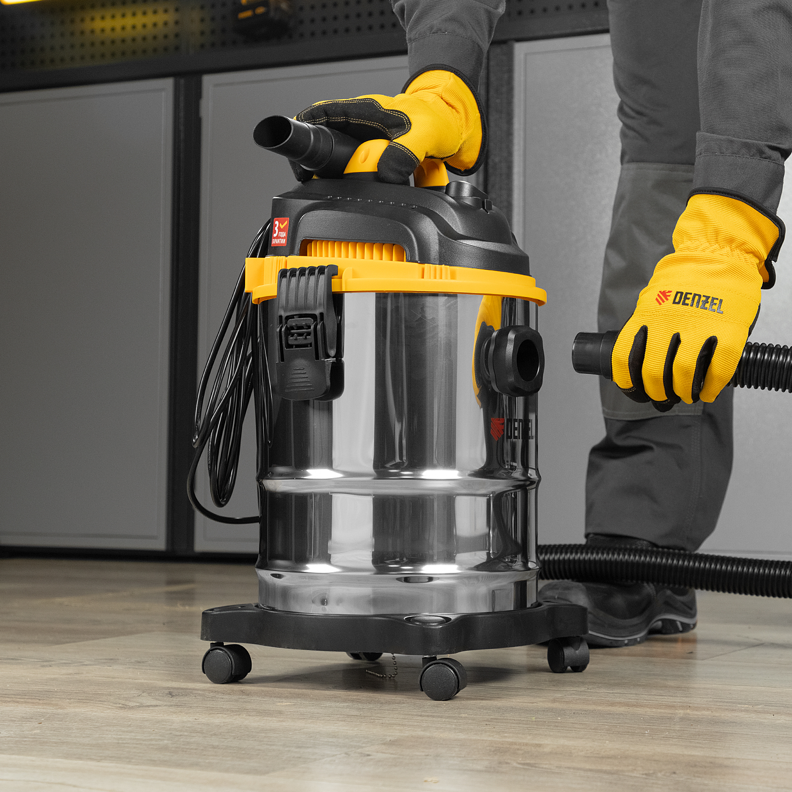 Пылесос строительный Denzel SVC15 28201 мощностью 1200 Вт, с баком объемом 15 л и шлангом длиной 2 м, предназначен для уборки бетонной, кирпичной пыли, опилок, стружки, также предусмотрена функция сбора воды. Пылесос используется во время проведения строительных и ремонтных работ, будет полезен для поддержания чистоты в мастерской, гараже, производственном помещении.