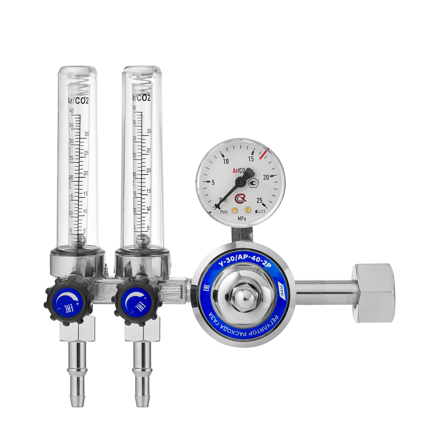 Корпус регулятора изготовлен из латуни, никелированное покрытие. Корпус спаренных ротаметров изготовлен из силумина - сплав алюминия с кремнием. Колбы ротаметров изготовлены из прочного пластика, которые имеют две шкалы Ar/CO2.