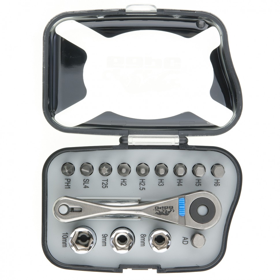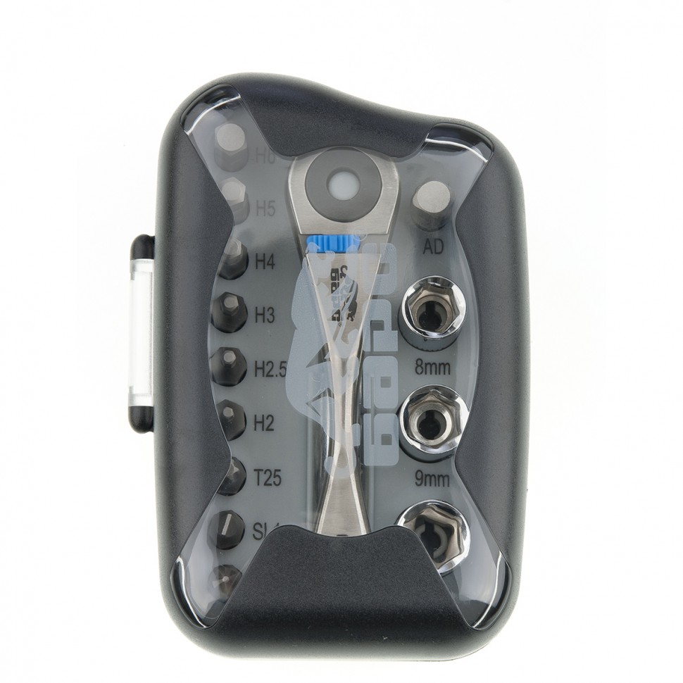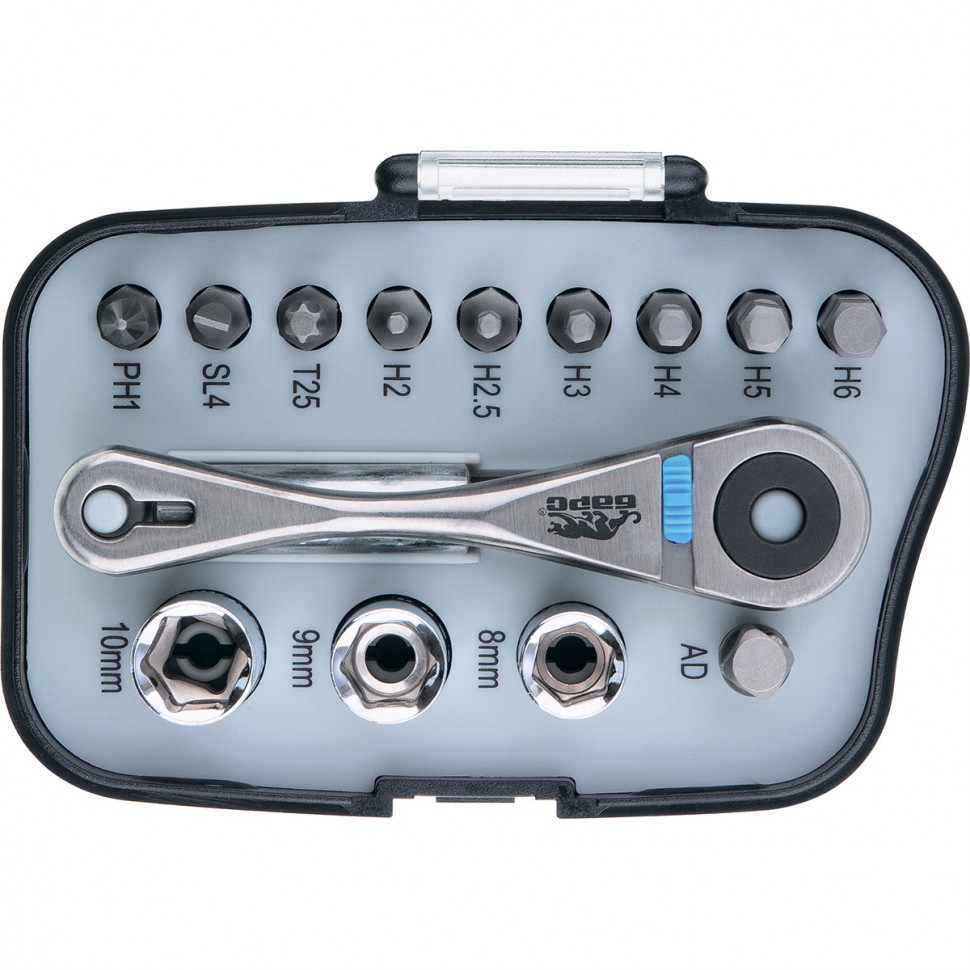 Трещотка с набором бит, изготовленных из хромованадиевой стали.
