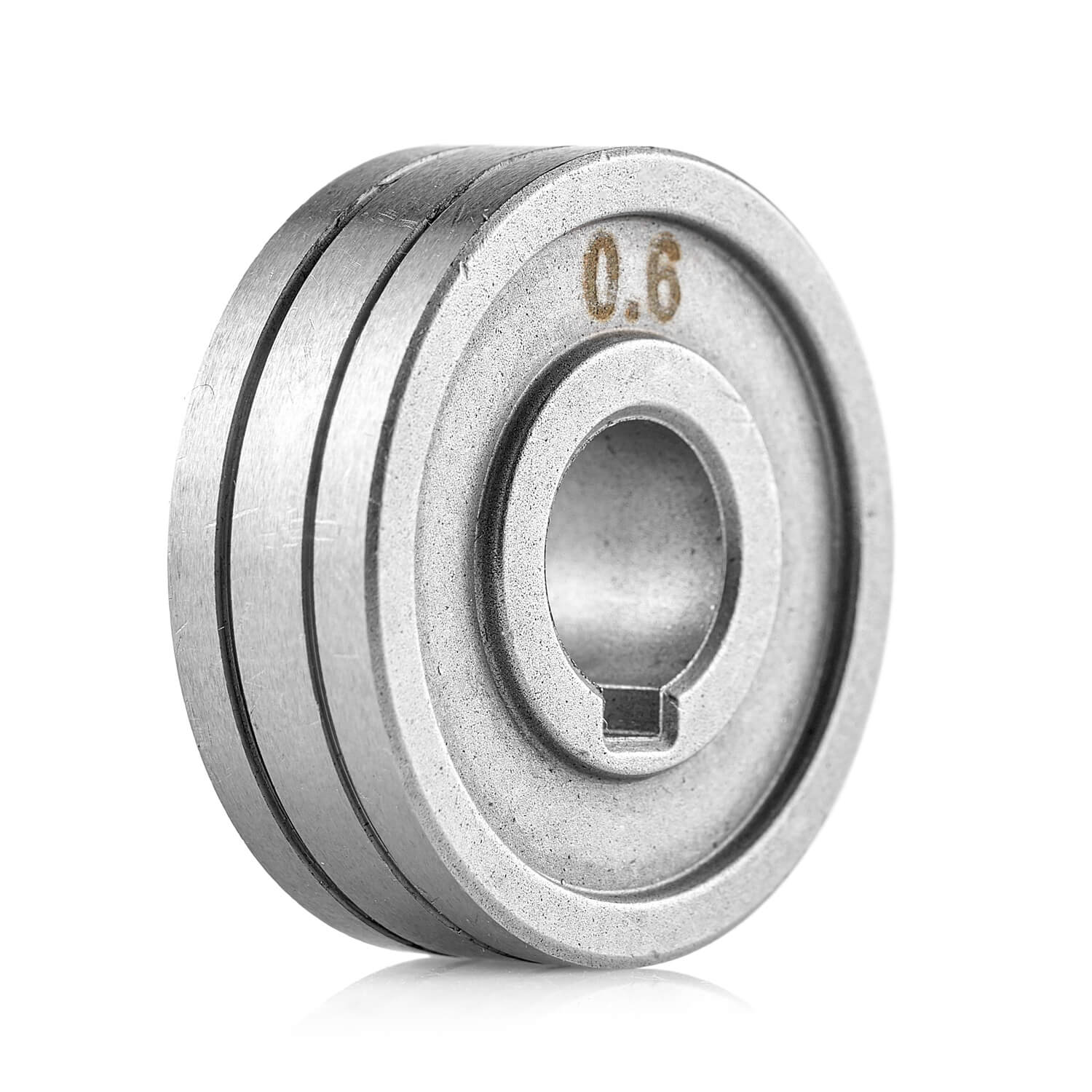 Это сменный элемент подающего механизма, который подбирается в соответствии с видом сварочной проволоки и ее диаметром. Данные ролики предназначены для работы со стальной проволокой диаметром 0,6–0,8 мм. Размер роликов 30х10х10 мм. Подающие ролики имеют две направляющие канавки V-образной формы. При изменении сечения проволоки необходимо перевернуть ролик нужной стороной и использовать его далее.