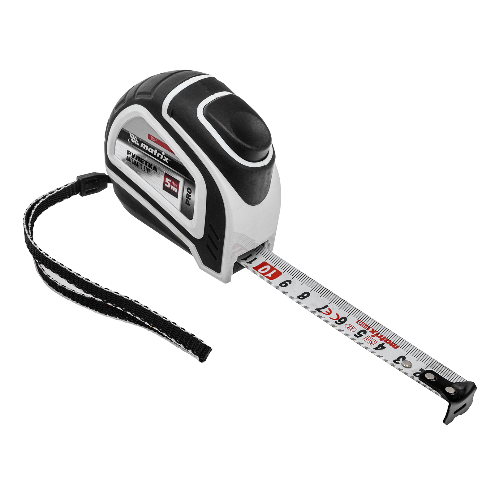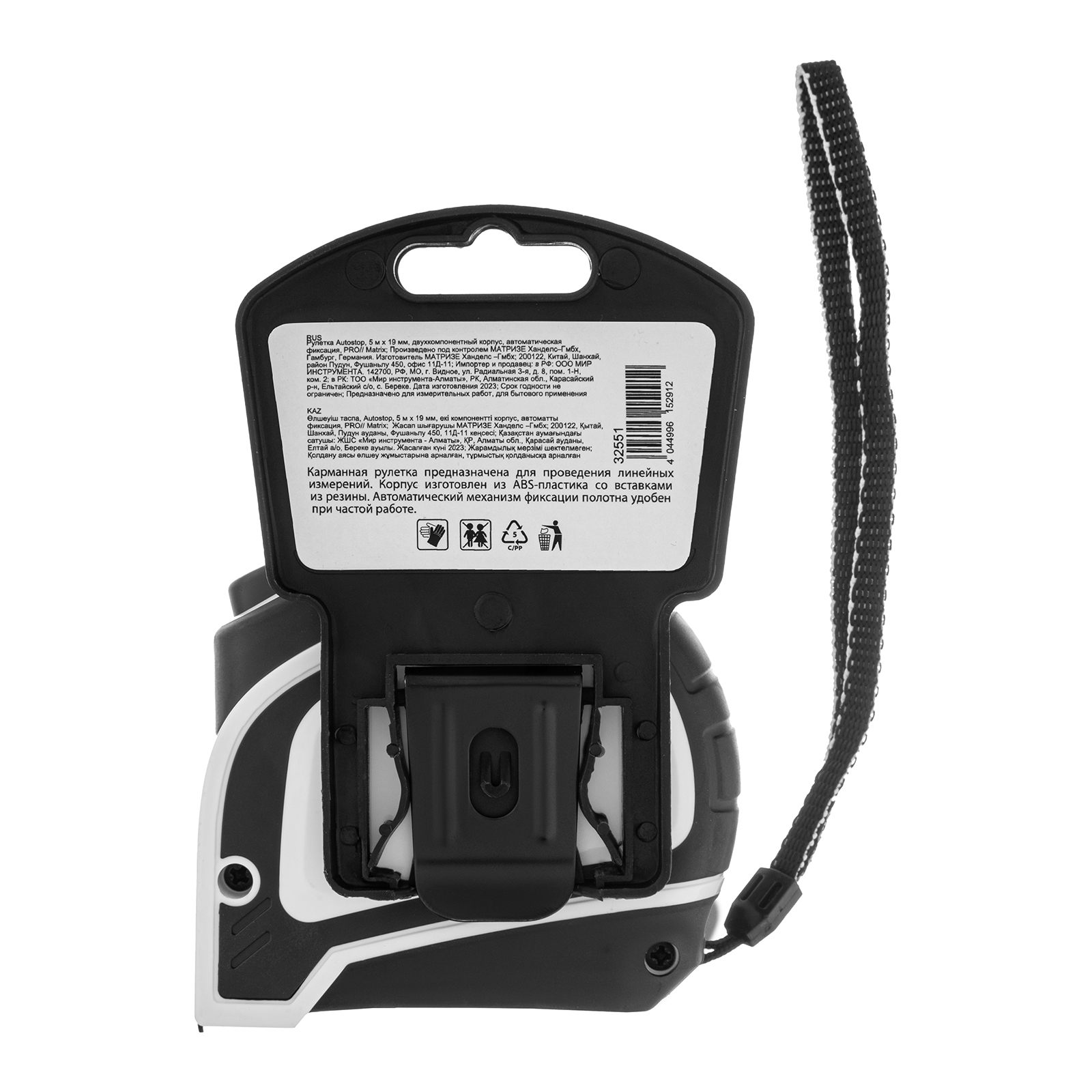 Рулетка Matrix PRO Autostop 32551 с полотном длиной 5 м и шириной 19 мм, в двухкомпонентном корпусе, с автоматической фиксацией ленты, используется для измерения объектов и расстояний. Корпус изготовлен из ударопрочного ABS-пластика, резиновые элементы увеличивают его сопротивляемость механическим нагрузкам. Заклепки надежно фиксируют зацеп на конце измерительного полотна. Рулетка подходит для профессионального и бытового применения.
