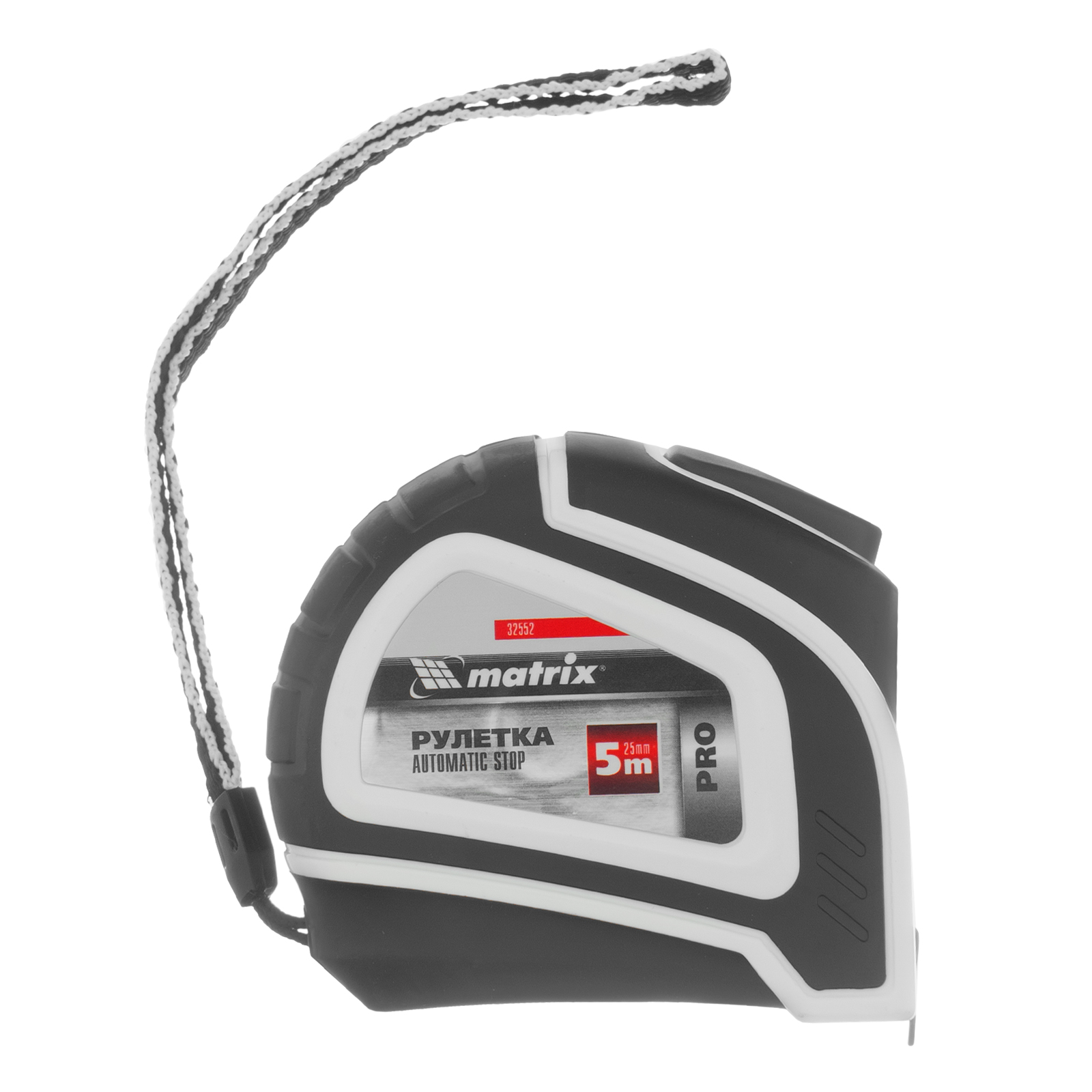Рулетка Matrix PRO Autostop 32552 с полотном длиной 5 м и шириной 25 мм, в двухкомпонентном корпусе, с автоматической фиксацией ленты, используется для измерения объектов и расстояний. Корпус изготовлен из ударопрочного ABS-пластика, резиновые элементы увеличивают его сопротивляемость механическим нагрузкам. Заклепки надежно фиксируют зацеп на конце измерительного полотна. Рулетка подходит для профессионального и бытового применения.