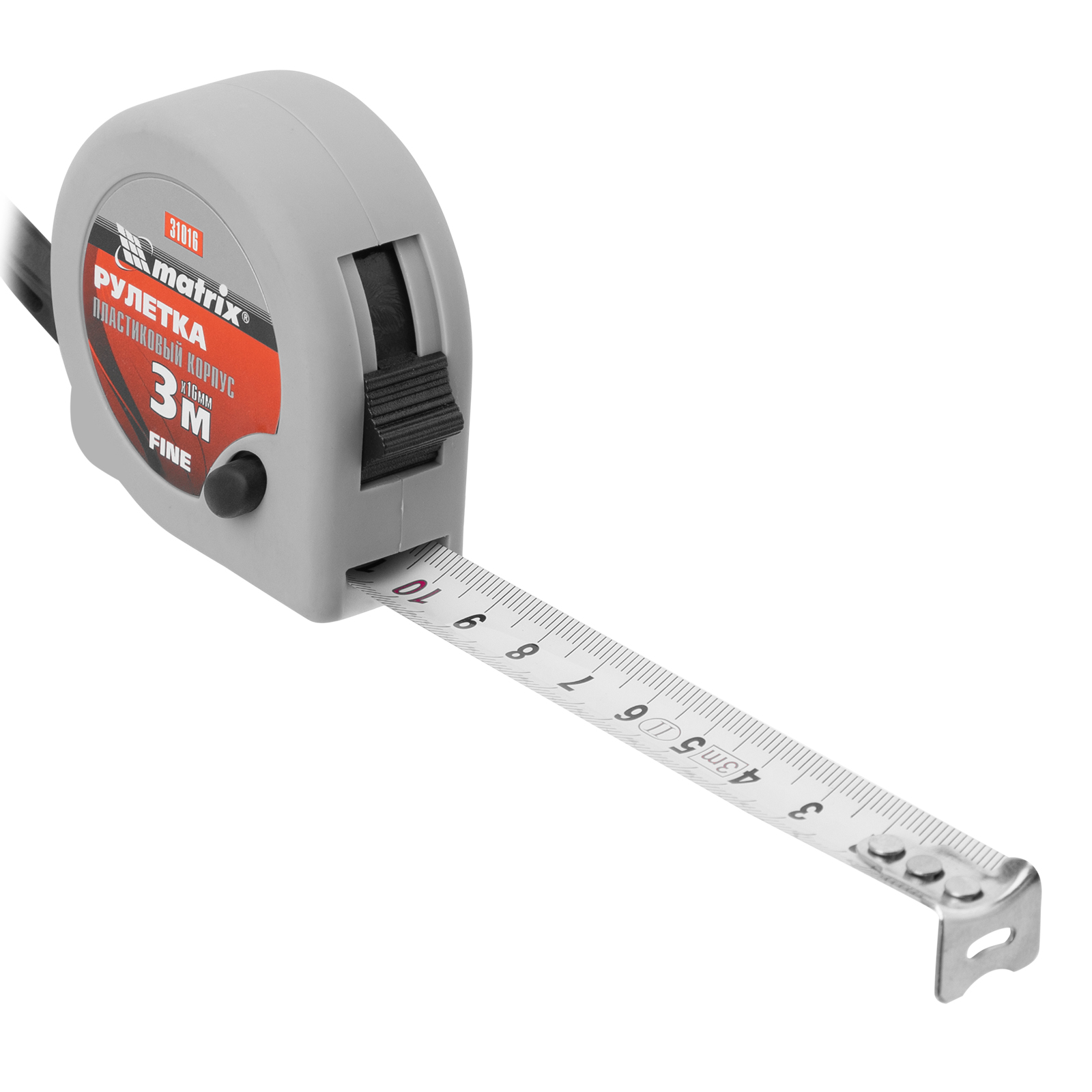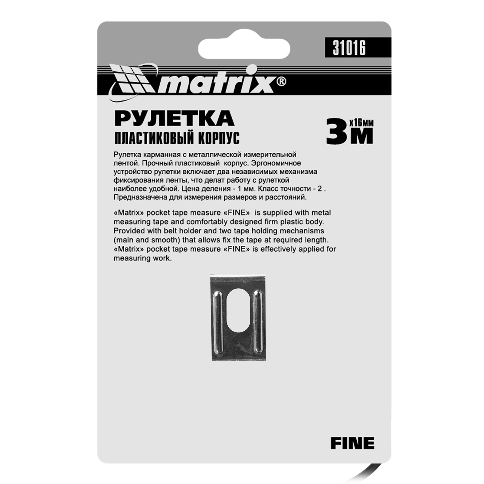 Рулетка Matrix Fine 31016 с лентой длиной 3 м и шириной 16 мм, в пластиковом корпусе, используется для замера расстояний и определения размеров различных объектов. Имеет наиболее распространенный класс точности 2, цена деления составляет 1 мм. Стопор и кнопка-пауза для фиксации ленты облегчают проведение измерений. Инструмент применяется как во время строительных работ, так и в быту.