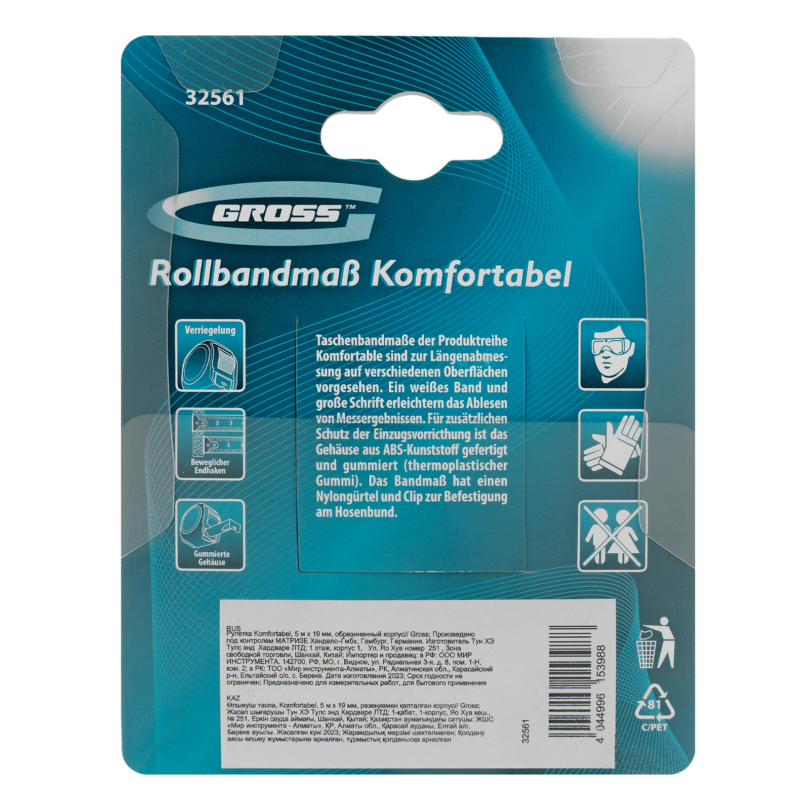 Рулетка Komfortabel 5 м х 19 мм,обрезиненный корпус Gross в Челябинске