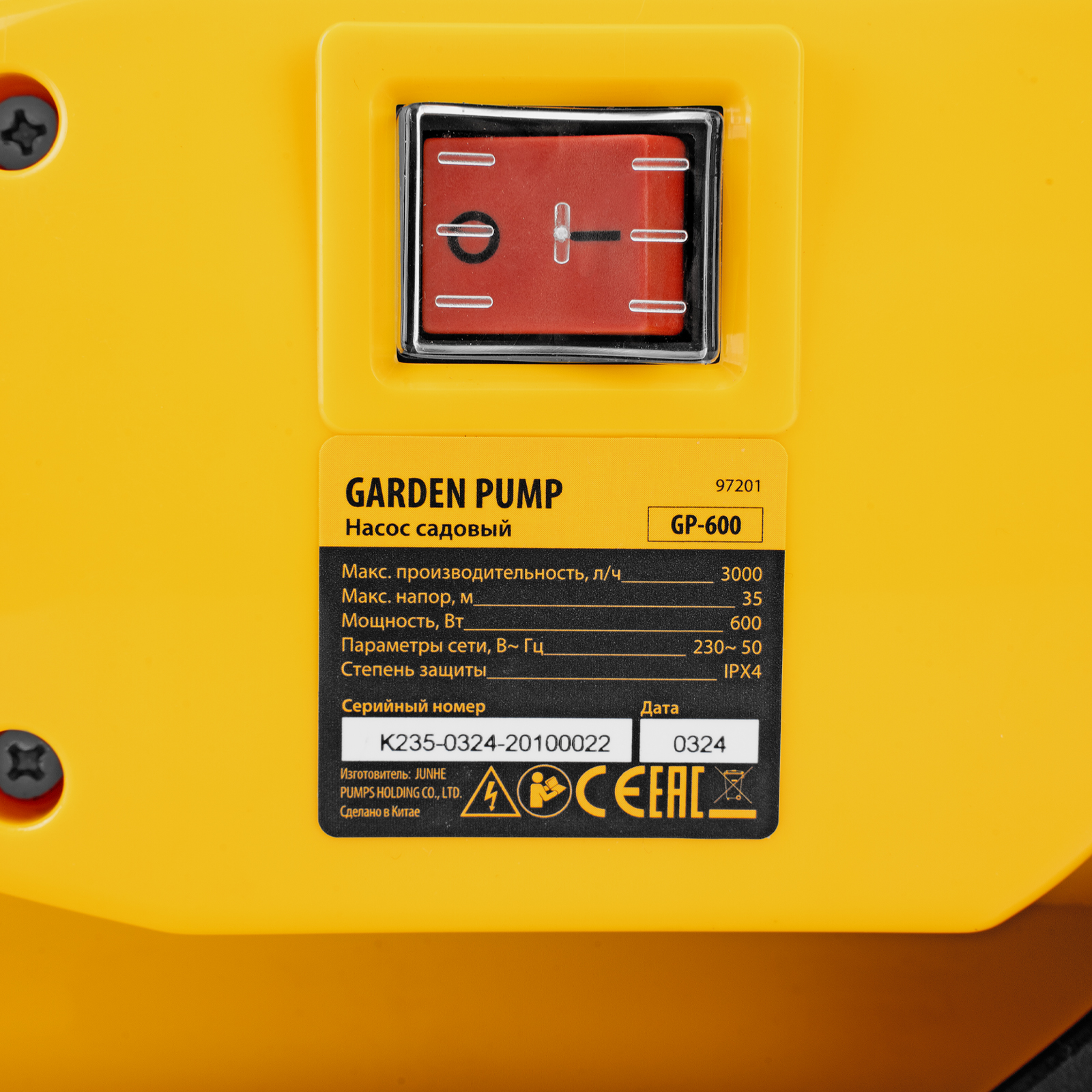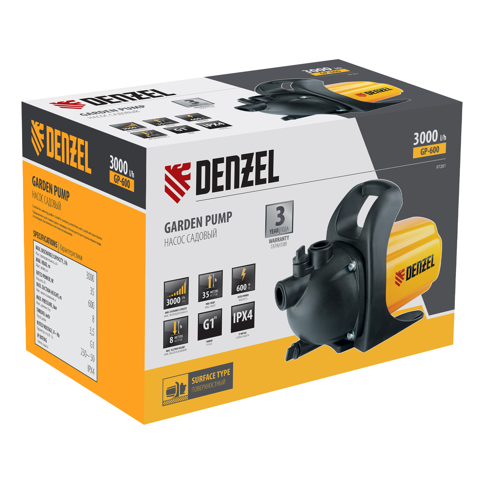 Садовый поверхностный насос Denzel GP600 97201, с корпусом из пластика, мощностью 600 Вт и производительностью 3000 л/ч, забирает воду с глубины до 8 м и поднимает на высоту до 35 м. Используется для организации систем водоснабжения и орошения, а также для усиления и стабилизации напора в водопроводе загородного дома. Благодаря высоким показателям производительности и напора подходит для обеспечения нескольких точек разбора воды.
