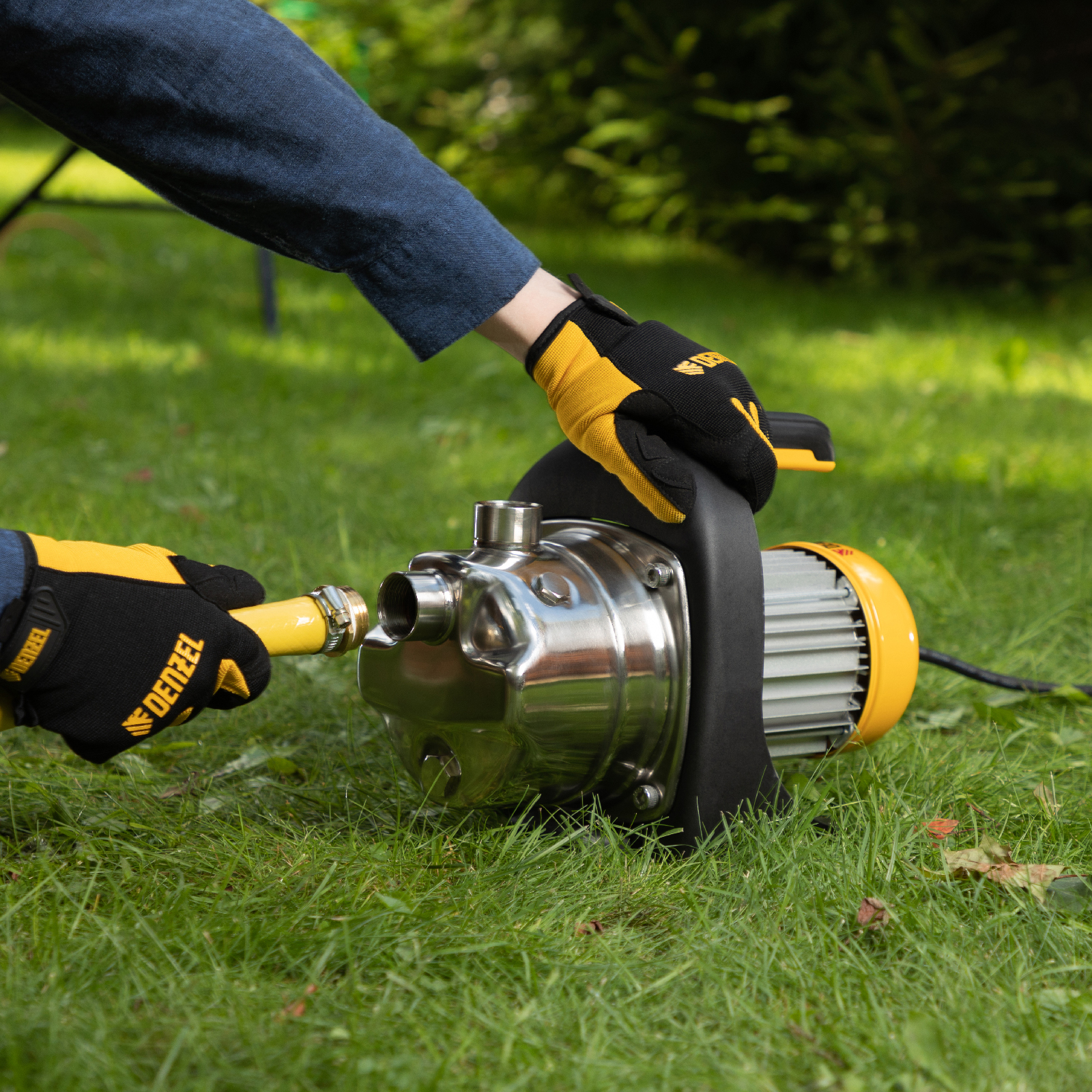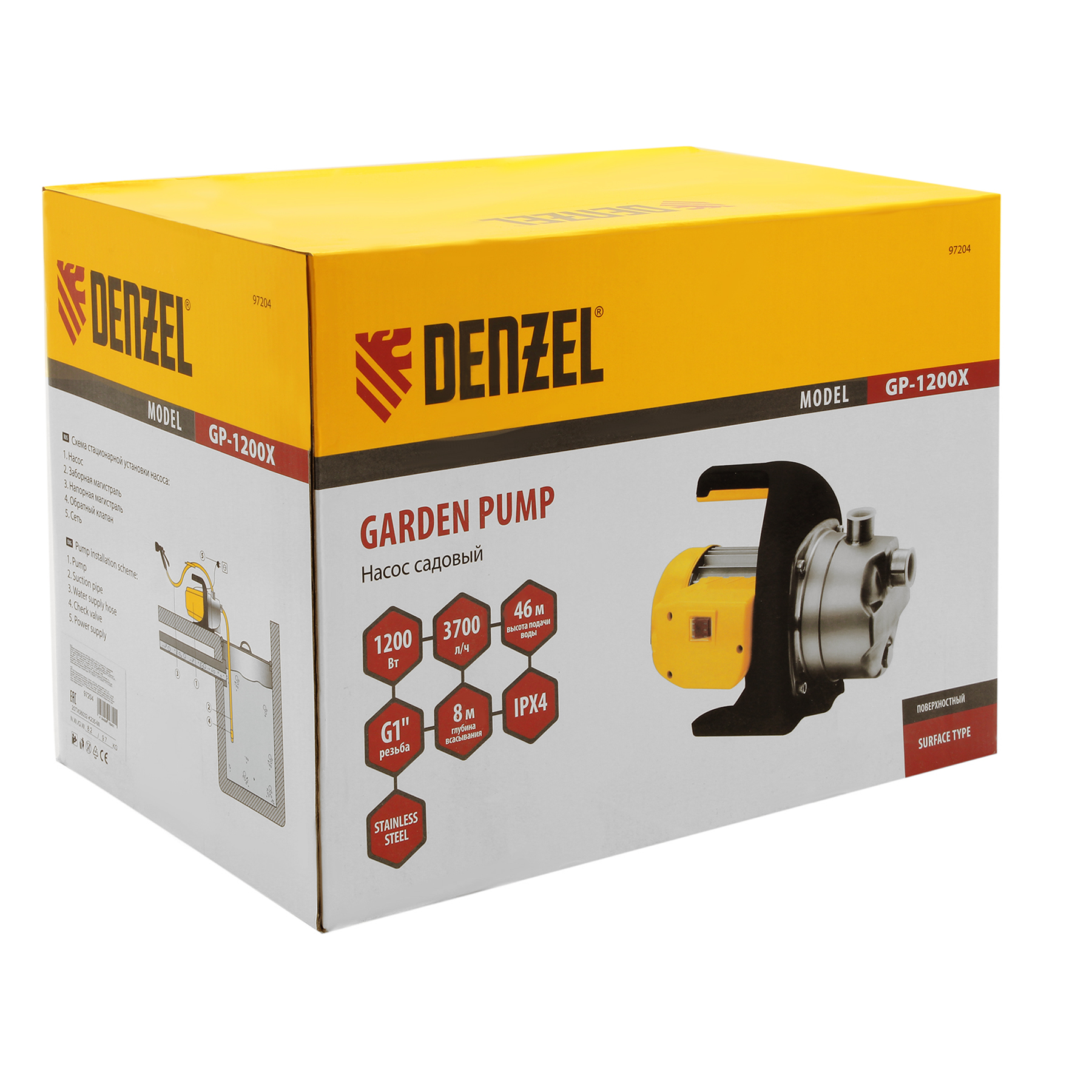 Садовый поверхностный насос Denzel GP1200X 97204 с корпусом насосной части из «нержавейки», мощностью 1200 Вт и производительностью 3700 л/ч, способен забирать чистую воду с глубины до 8 м из колодцев, емкостей и водоемов и подавать ее на высоту до 46 м. Обеспечивает стабильный напор и используется для организации системы полива и водоснабжения на даче. Производительности хватает для одновременного снабжения нескольких водоразборных точек.