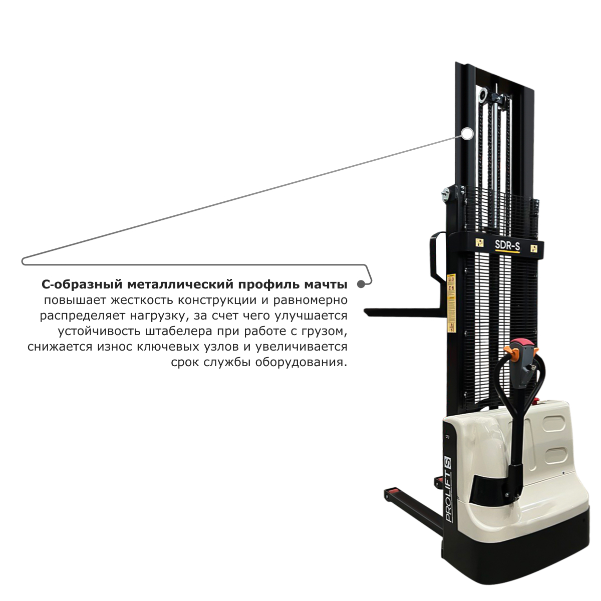 Самоходный электрический штабелер PROLIFT M2 грузоподъемность 1500 кг, высота подъема 2500 мм SDR 1525s предназначен для поднятия груза весом до 1500 кг на высоту до 2500 мм. Подъем груза и перемещение штабелера осуществляется благодаря двум электродвигателям без необходимости прилагать физические усилия оператору, что значительно облегчает труд сотрудника и повышает производительность.