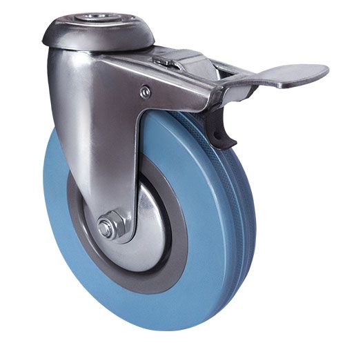 Колесо аппаратное поворотное под болт с тормозом SChgb 55 предназначено для легкого торгового, лабораторного, медицинского, гостиничного, офисного и складского оборудования. Шинка выполнена из термопластичной серой резины. В оси установлен подшипник скольжения. Кронштейн с креплением «под болт» изготовлен из оцинкованной стали. Полипропиленовый обод закрыт стальными кожухами. Не оставляет следов на напольных покрытиях. Отличается хорошими ходовыми качествами, повышенной маневренностью, низким уровнем шума, устойчивостью к внешним химическим воздействиям. Диапазон температур — от -35ºC до +60ºC.