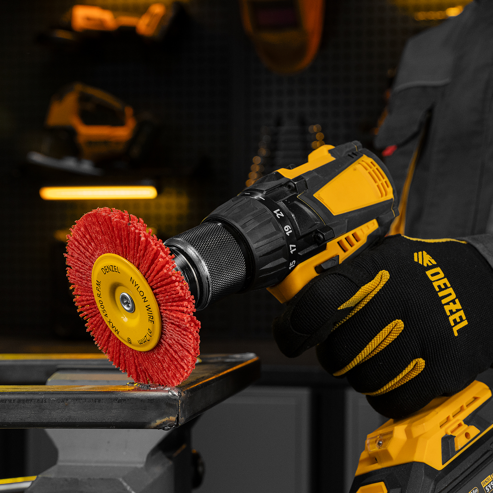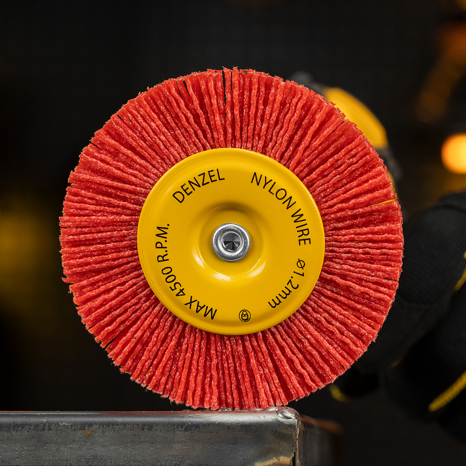 Плоская щетка Denzel 74434 диаметром 100 мм, со шпилькой и нейлоновой щетиной, — насадка для дрели, предназначенная для выполнения шлифовальных работ по пластику, древесине, стали и цветным металлам. Щетина изготовлена из высококачественного нейлона с нанесенным абразивом из оксида алюминия. Щетка оптимальна для деликатного удаления загрязнений, краски, пятен ржавчины с твердых поверхностей. Позволяет придать шероховатость поверхности, подходит для браширования древесины. Благодаря плоской форме насадка удобна для обработки пазов, изгибов и угловых соединений.