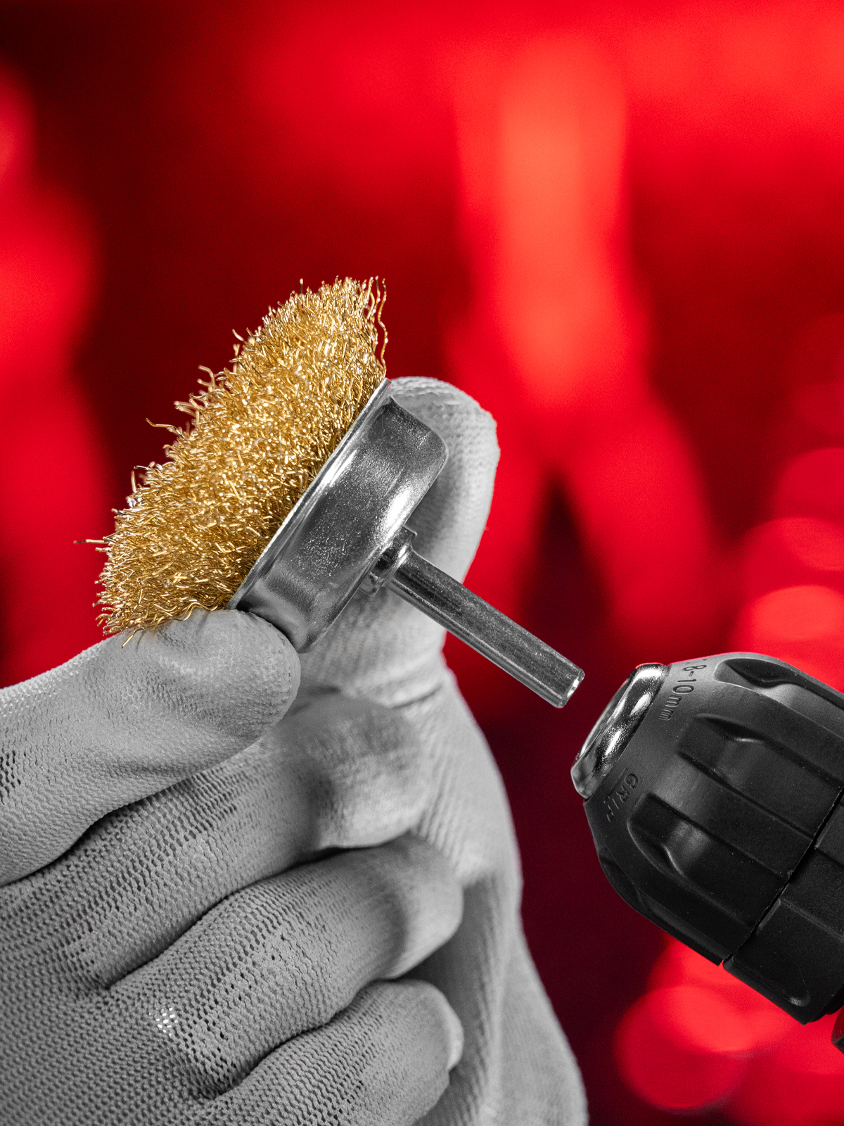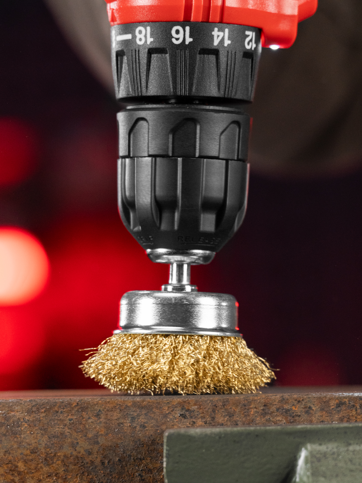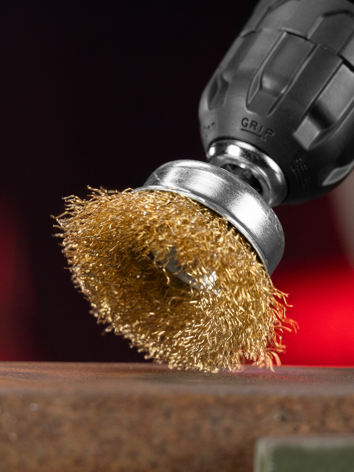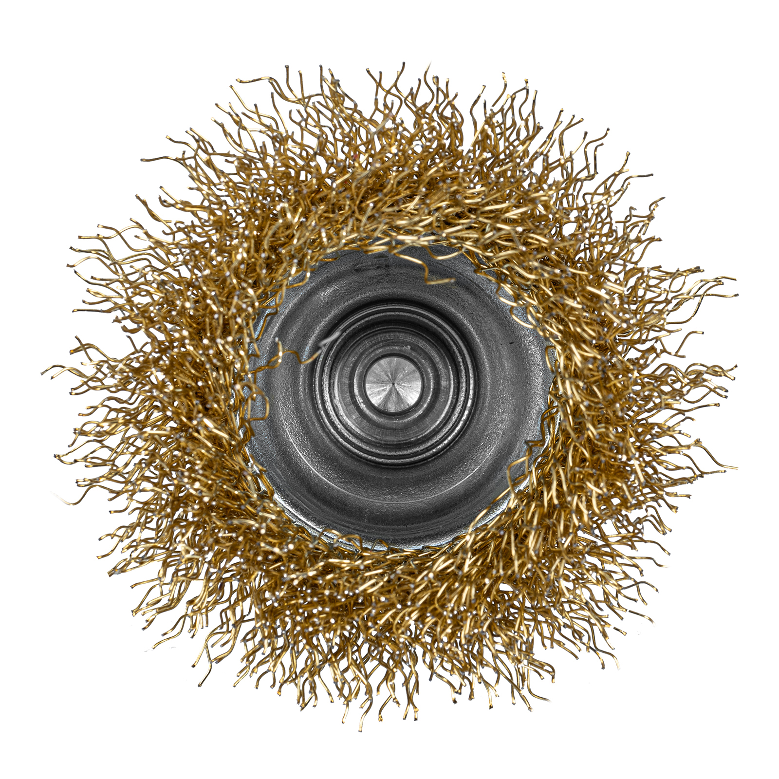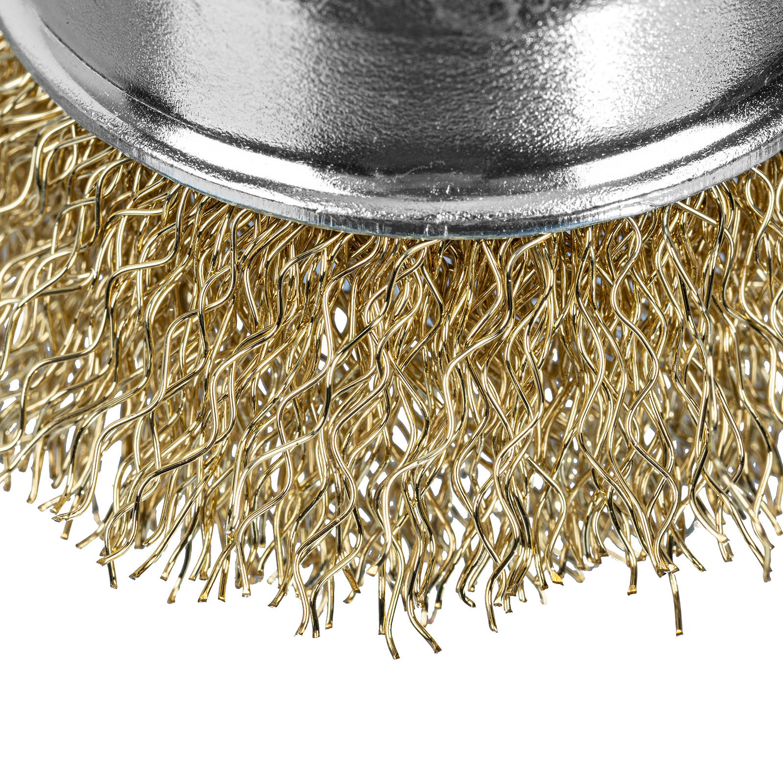 Щетка для дрели «чашка» Matrix 74475 диаметром 50 мм, со шпилькой и щетиной из латунированной витой проволоки, используется для очистки металлических, деревянных и пластиковых поверхностей от незначительных загрязнений и остатков лакокрасочных покрытий. Помогает подчеркнуть структуру материала или придать ему шероховатость. Хвостовик диаметром 6 мм устанавливается в патрон электродрели, поддерживающей скорость 4500 об/мин. Во время работы нужно использовать средства индивидуальной защиты — респиратор, очки, наушники, спецодежду и обувь. Щетка пригодится как профессиональным, так и домашним мастерам.