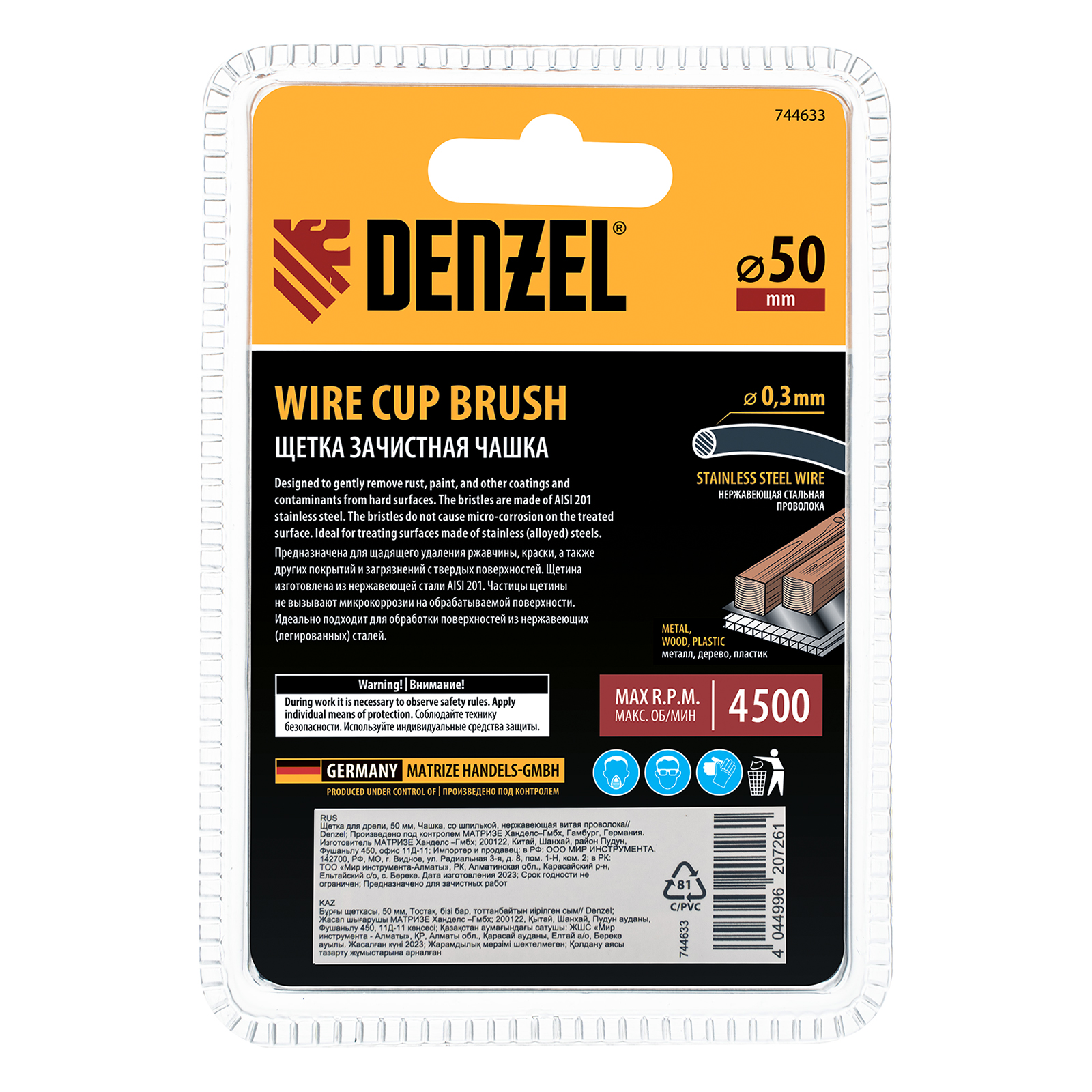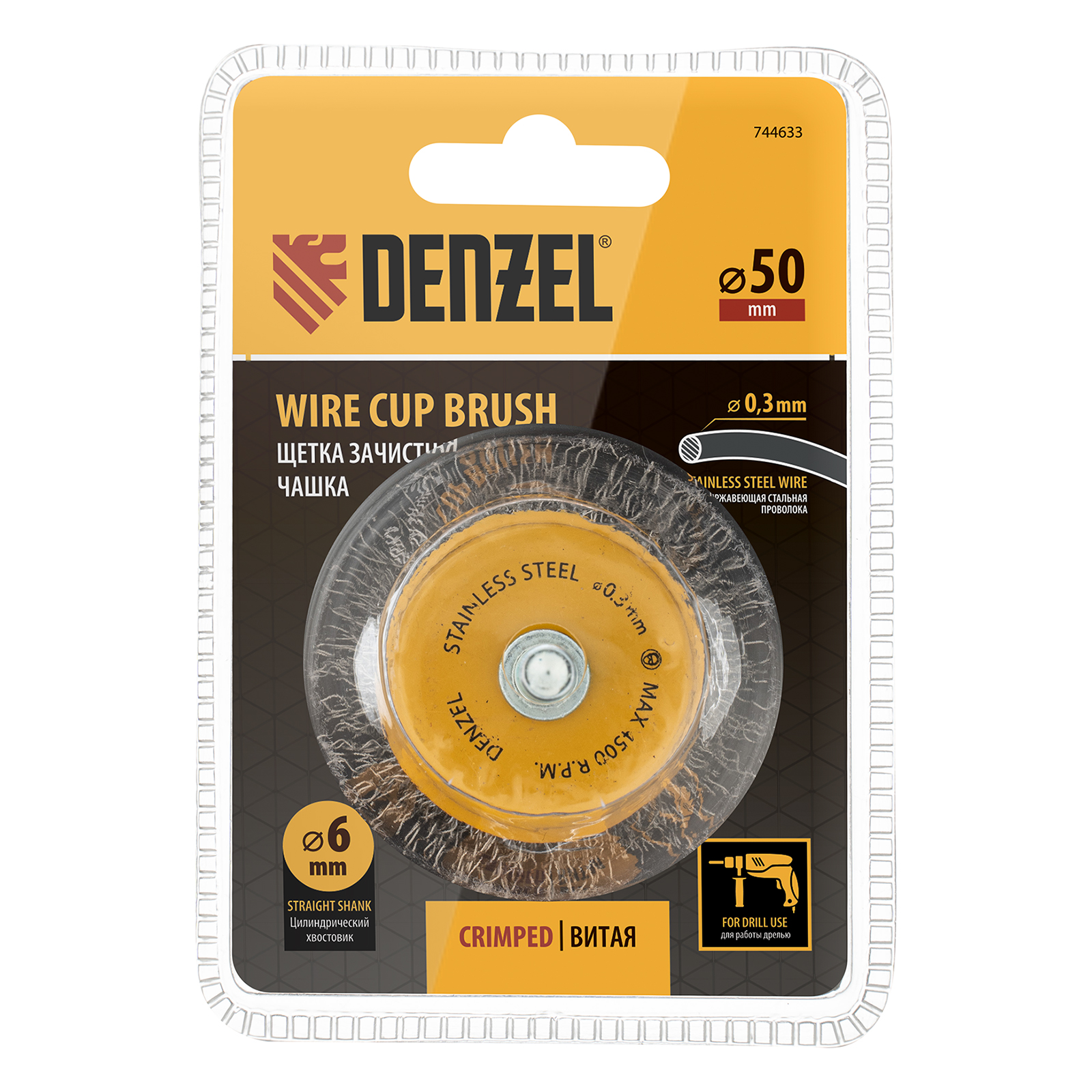Щетка для дрели, 50 мм, Чашка, со шпилькой, нержавеющая витая проволока Denzel в Челябинске