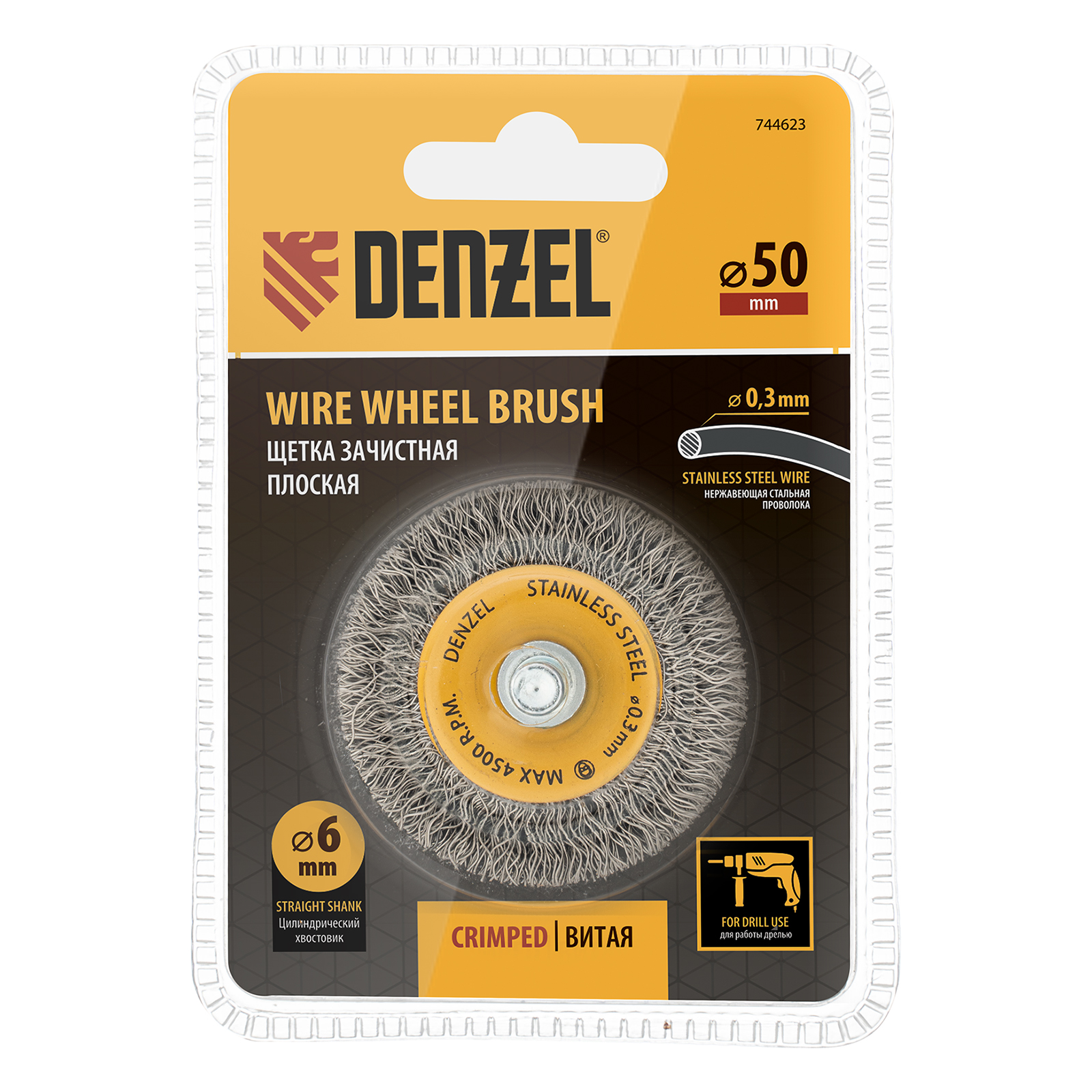 Щетка для дрели, 50 мм, Плоская, со шпилькой, нержавеющая витая проволока Denzel в Челябинске