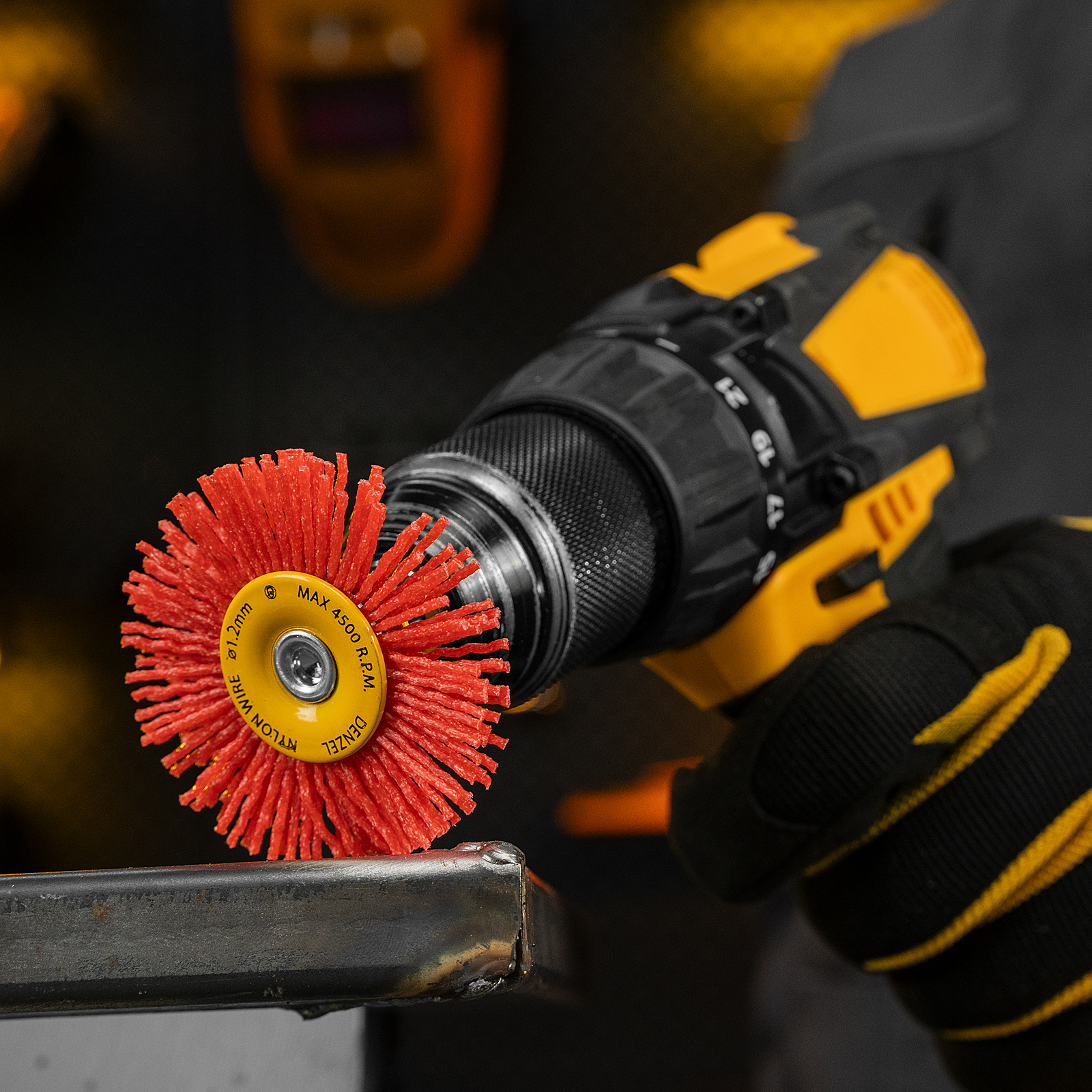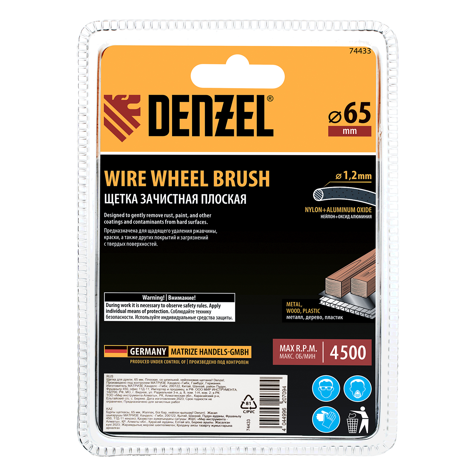 Плоская щетка Denzel 74433 диаметром 65 мм, со шпилькой и нейлоновой щетиной, — насадка для дрели, предназначенная для выполнения шлифовальных работ по пластику, древесине, стали и цветным металлам. Щетина изготовлена из высококачественного нейлона с нанесенным абразивом из оксида алюминия. Щетка оптимальна для деликатного удаления загрязнений, краски, пятен ржавчины с твердых поверхностей. Позволяет придать шероховатость поверхности, подходит для браширования древесины. Благодаря плоской форме насадка удобна для обработки пазов, изгибов и угловых соединений.