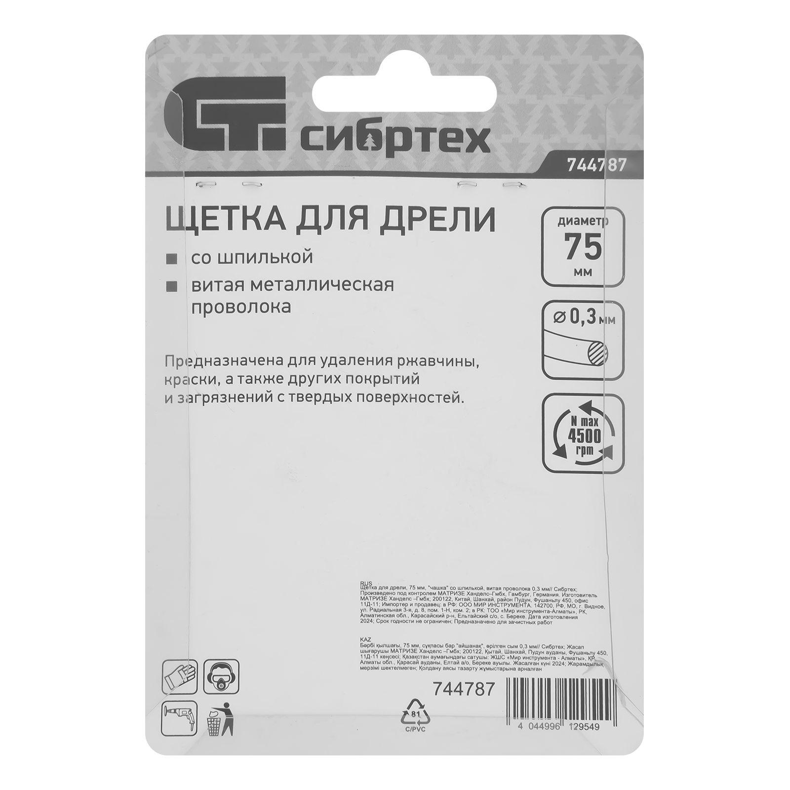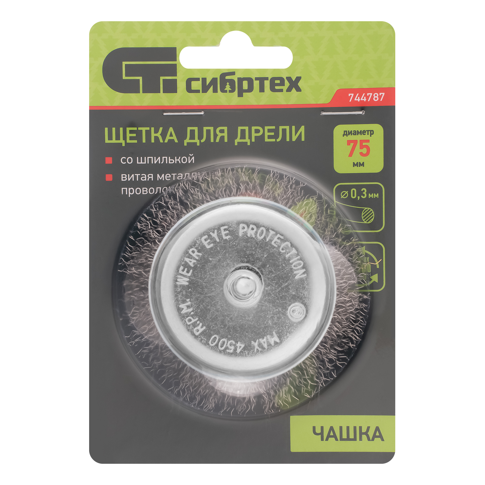 Щетка для дрели «чашка» Сибртех 744787 диаметром 75 мм, со шпилькой и щетиной из витой проволоки 0,3 мм, предназначена для щадящей обработки значительных по площади металлических, деревянных и пластиковых поверхностей — удаления загрязнений, остатков краски и лака, придания шероховатости или подчеркивания структуры материала. Насадка с хвостовиком 6 мм устанавливается в патрон электродрели, поддерживающей работу со скоростью 4500 об/мин. Во время работы с инструментом обязательно использование защитной одежды и обуви, очков, респиратора и наушников. Щетку применяют в профессиональной сфере и в быту.