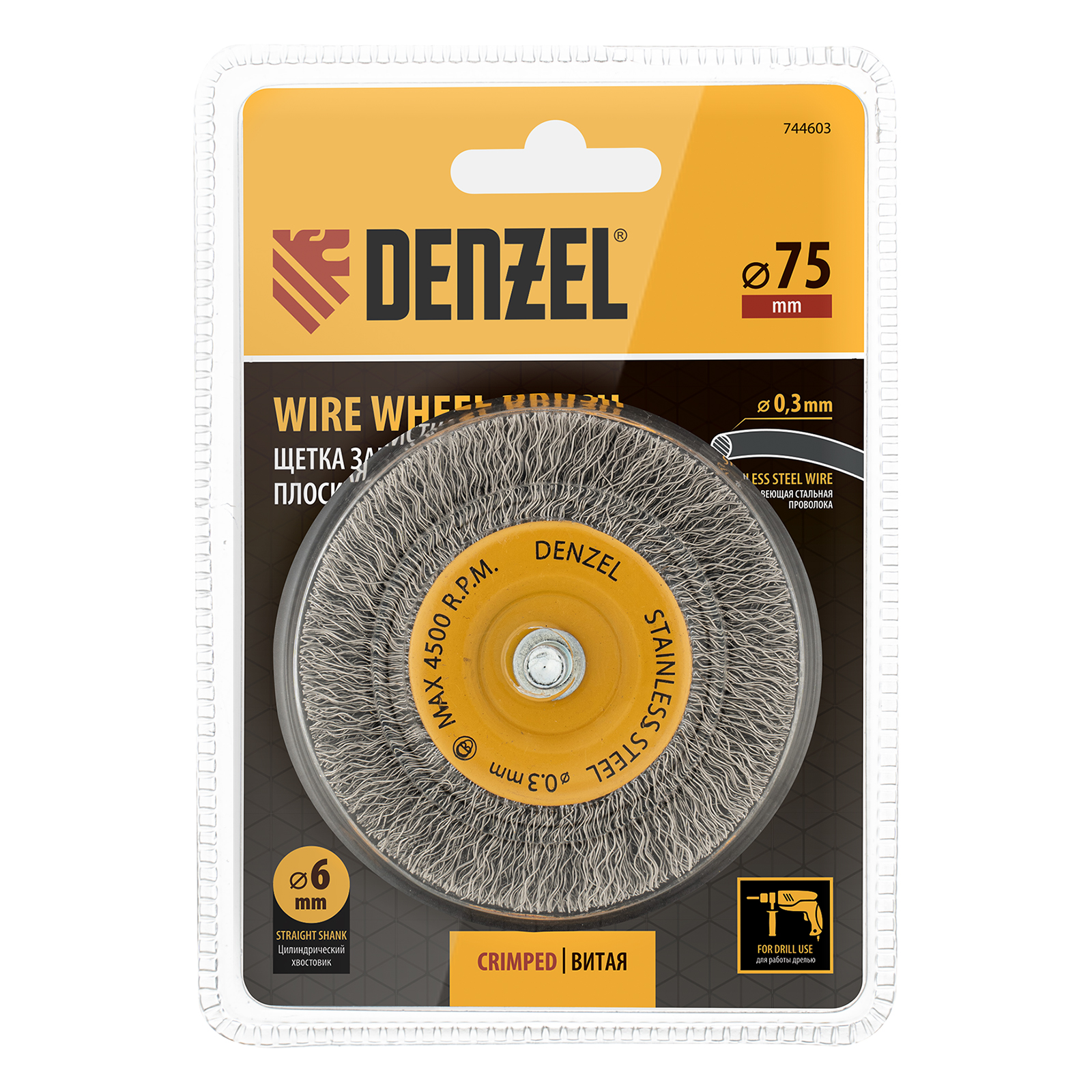 Щетка для дрели, 75 мм, Плоская, со шпилькой, нержавеющая витая проволока Denzel в Челябинске