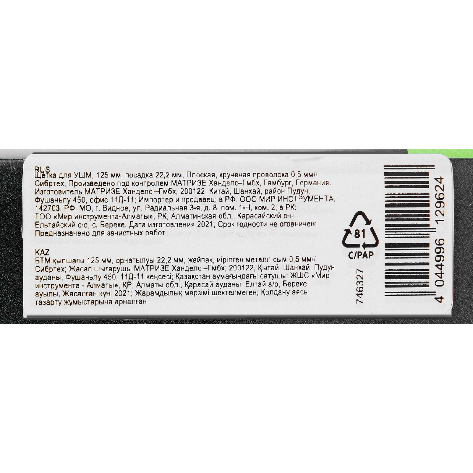 Плоская щетка Сибртех 746327 диаметром 125 мм и посадкой 22,2 мм, с щетиной из крученой проволоки толщиной 0,5 мм, устанавливается на вал УШМ, поддерживающей скорость вращения не более 10000 об/мин. Эффективно удаляет загрязнения, толстый слой ржавчины и лакокрасочных материалов с поверхностей, поэтому используется для проведения грубой (черновой) обработки. Плоской щеткой удобно очищать труднодоступные места, в том числе углы и изгибы.