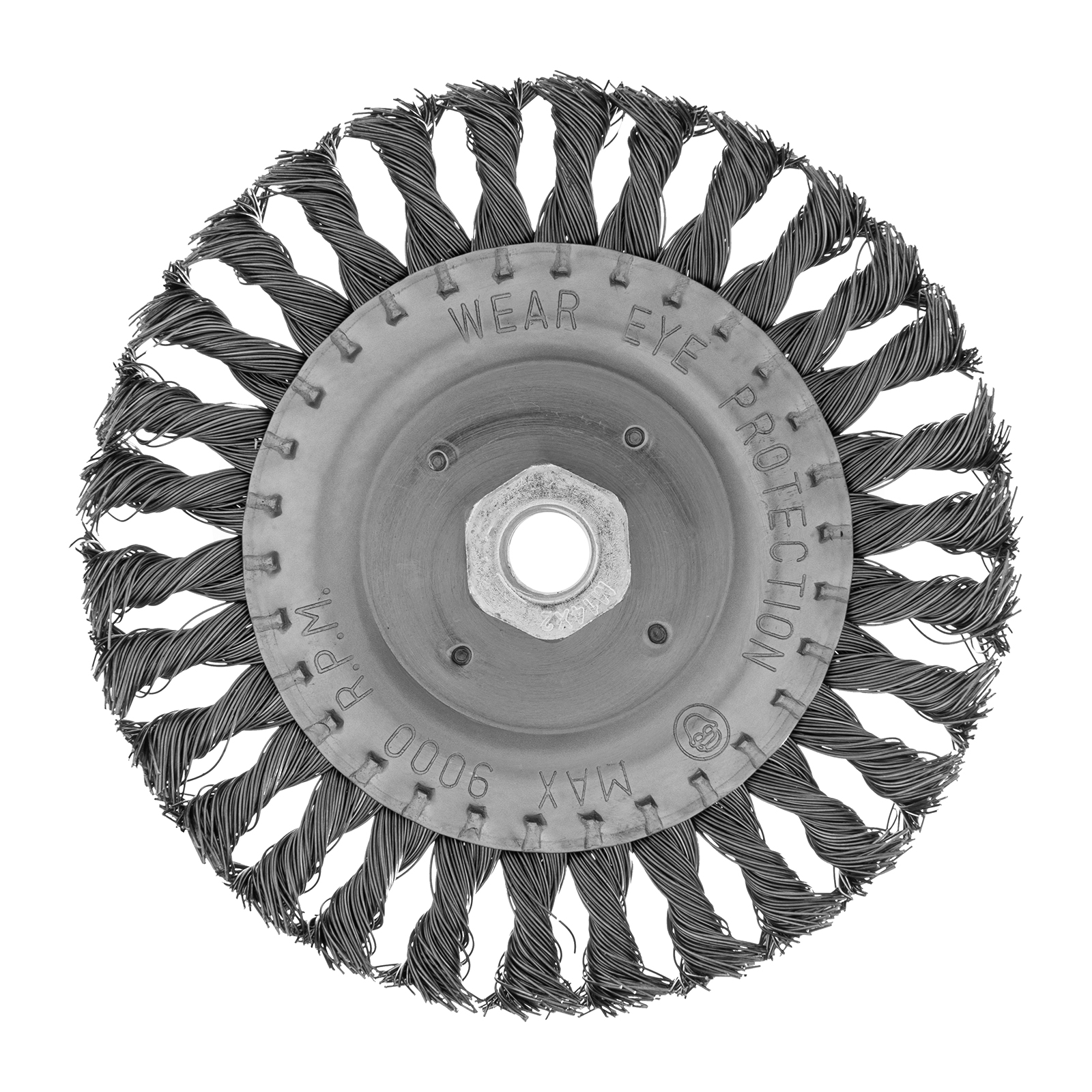 Плоская щетка Matrix 74641 диаметром 150 мм, с щетиной из крученой проволоки толщиной 0,5 мм и гайкой М14, — оснастка для УШМ, предназначенная для грубой (черновой) обработки поверхностей. Максимально допустимая скорость вращения шпинделя — 9000 об/мин. Щетка позволяет снять толстый слой ржавчины, лакокрасочных покрытий, загрязнений, а также зачистить сварные швы. Плоская форма удобна для обработки углов, изгибов и других труднодоступных мест.