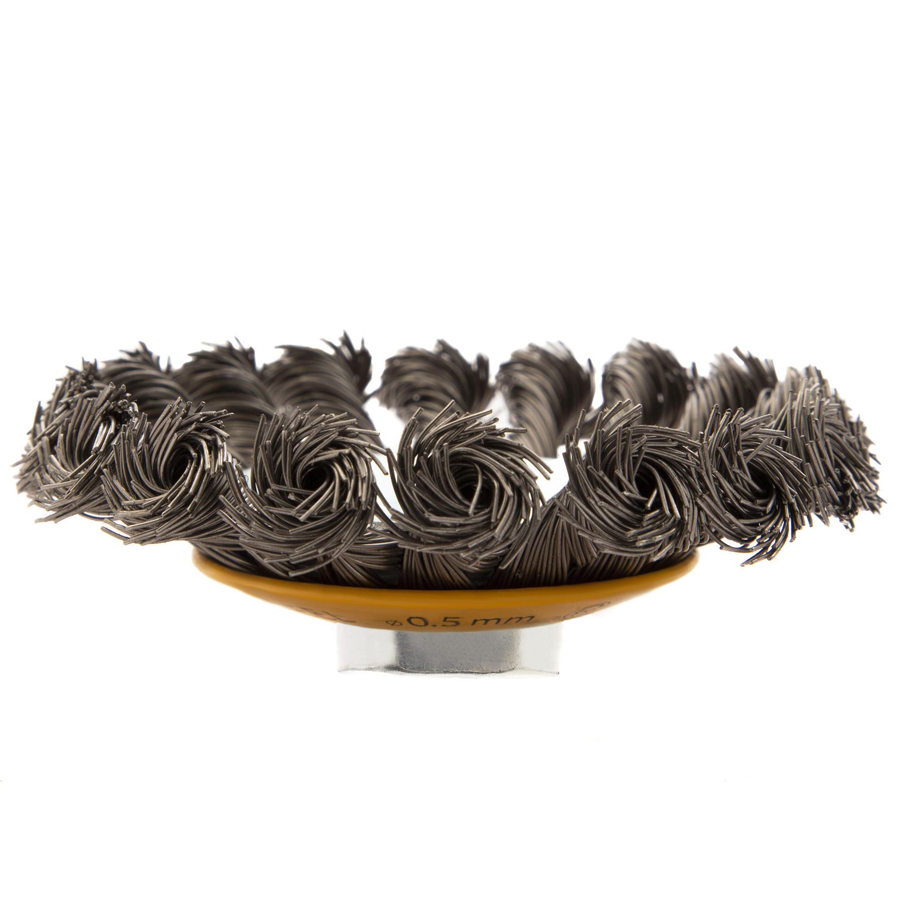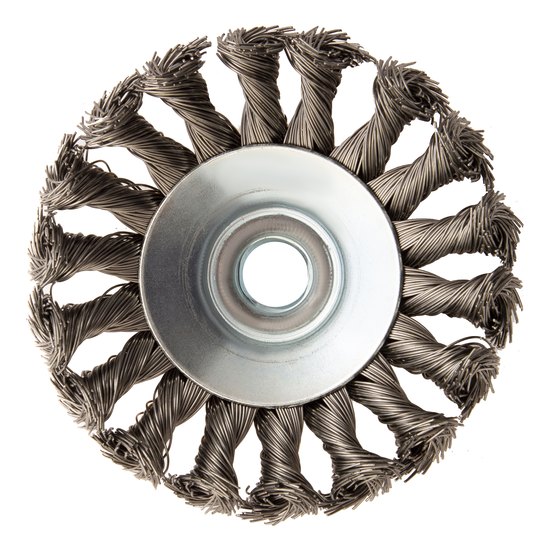 Щетка для УШМ Denzel «Тарелка» 746093, 100 мм, М14, с щетиной из крученой нержавеющей проволоки 0,5 мм, предназначена для снятия толстого слоя краски, лака, ржавчины, для удаления заусенцев и окалины, зачистки сварных швов. Щеткой обрабатывают твердые, преимущественно металлические поверхности, в том числе из нержавеющей стали. Она удобна для очистки как плоских изделий, так и внутренних углов, пазов, изгибов. Щетка совместима с углошлифовальными машинами, поддерживающими работу на скорости до 12500 об/мин. Во время работы необходимо использовать средства индивидуальной защиты. Щетка пригодится во время строительства, на производстве, а также будет полезна в быту.