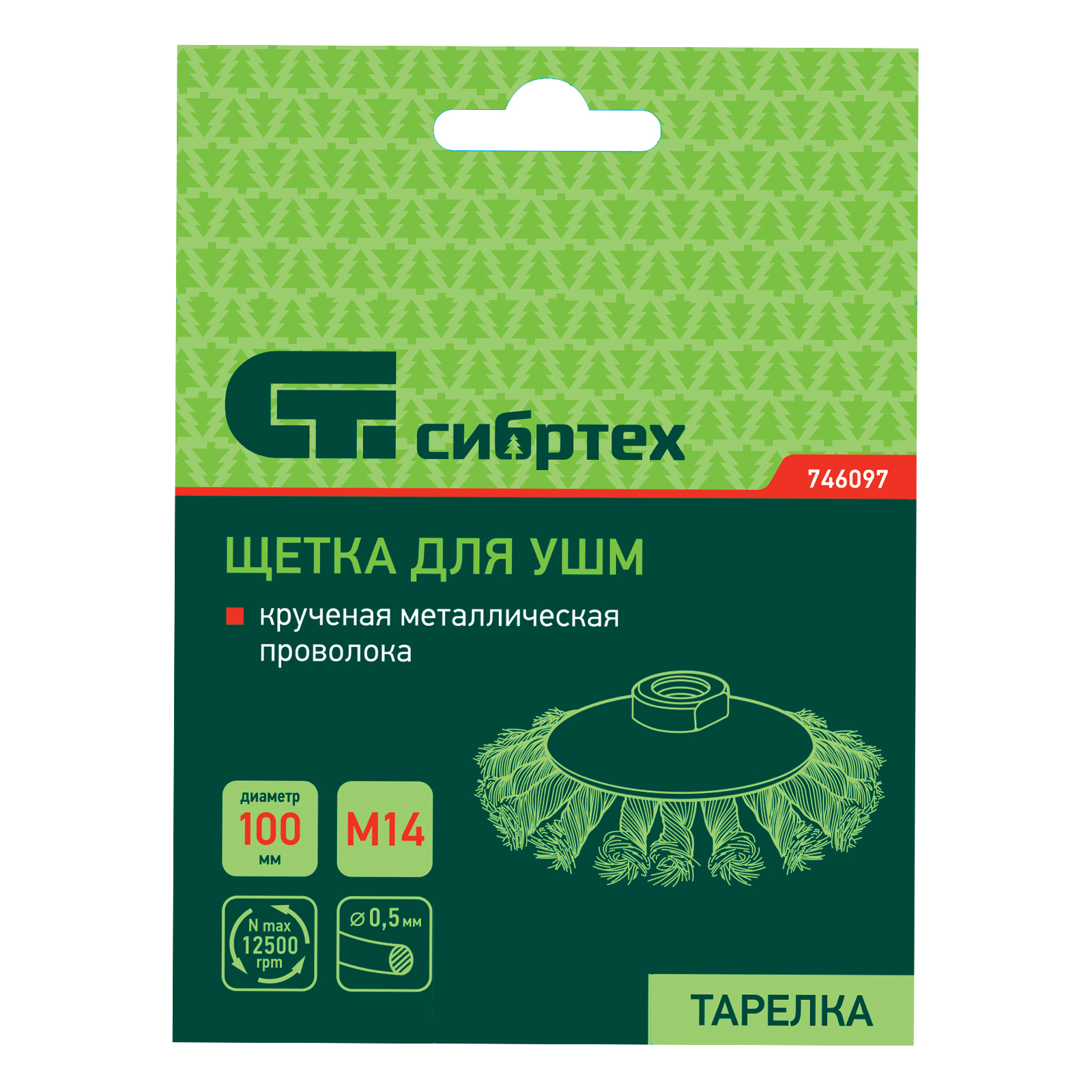 Щетка Сибртех «тарелка» 746097 диаметром 100 мм, с щетиной из крученой проволоки толщиной 0,5 мм, устанавливается на УШМ при помощи гайки М14. Выполнена в форме тарелки, за счет чего подходит для грубой (черновой) обработки плоских и угловых поверхностей. Удаляет ржавчину, загрязнения, лакокрасочные покрытия, подходит для зачистки сварных швов. Использование на скорости до 12500 об/мин позволяет продлить срок службы насадки.