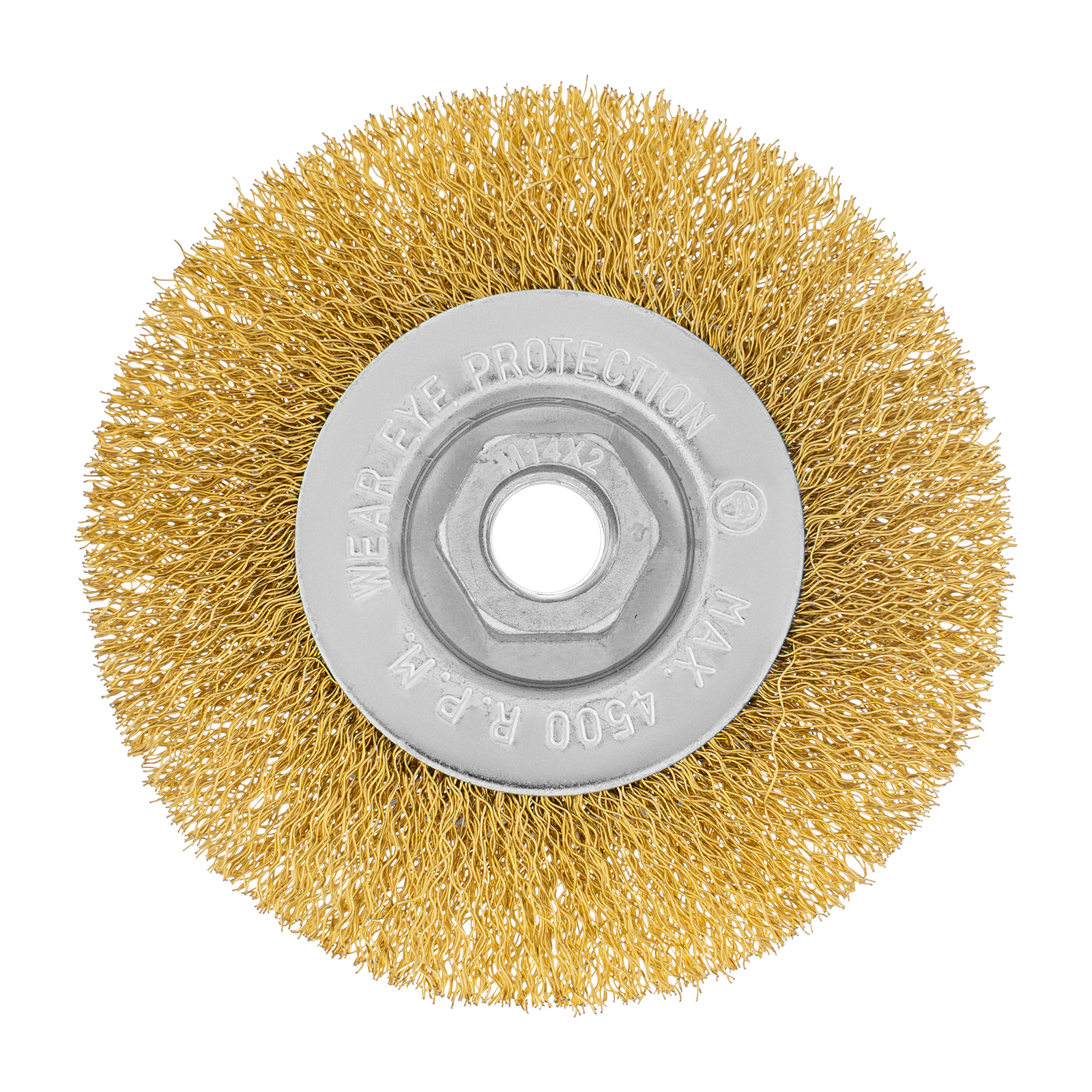 Плоская щетка Matrix 74650 диаметром 100 мм, с щетиной из латунированной витой проволоки, крепится к валу УШМ с помощью гайки М14. Используется для щадящей обработки поверхностей, снятия тонкого слоя ржавчины, лакокрасочных покрытий, удаления въевшихся загрязнений. Плоской щеткой удобно работать в труднодоступных местах: углах и изгибах. При эксплуатации на рекомендованной скорости 4500 об/мин оснастка прослужит долго.