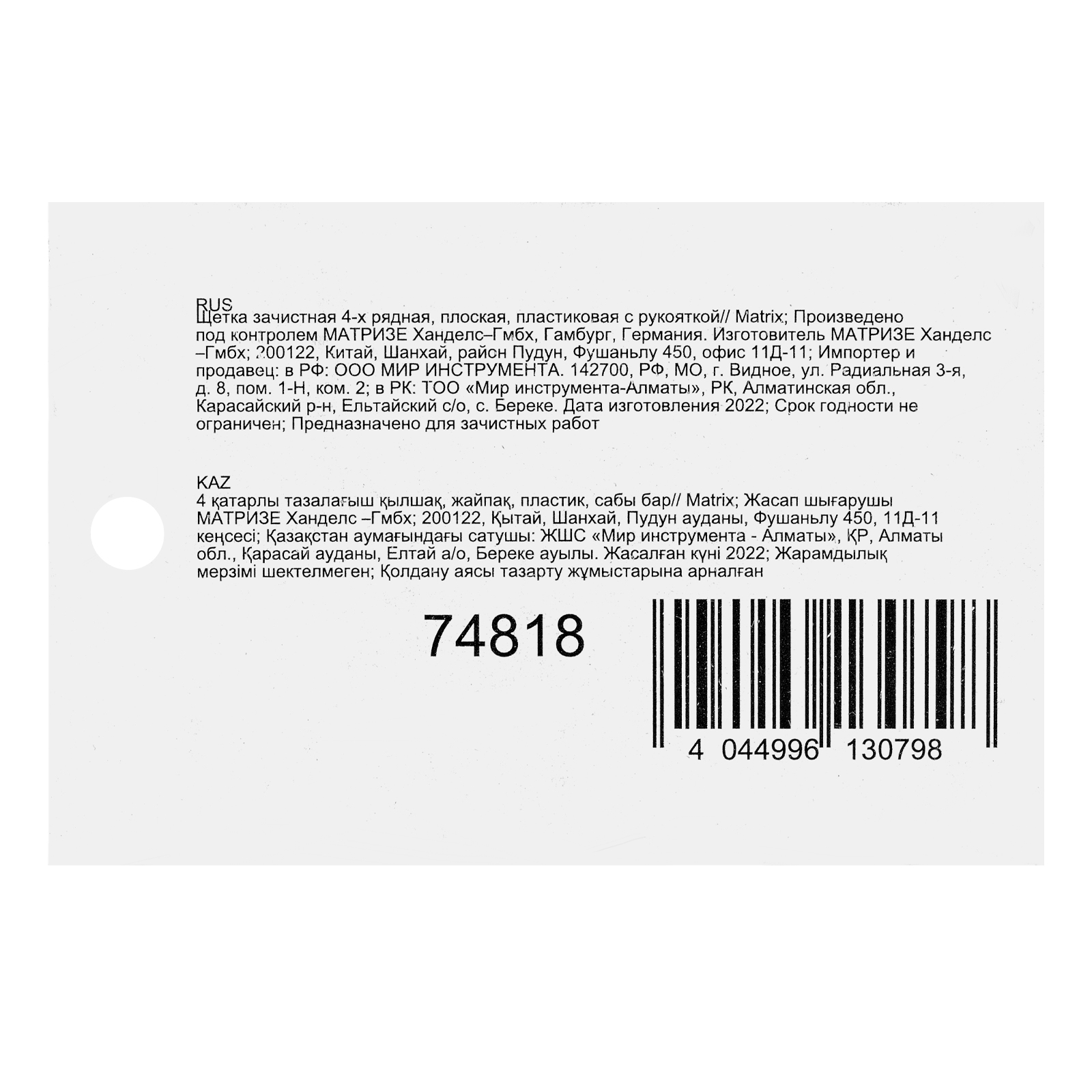 Плоская зачистная 4-рядная щетка Matrix 74818, пластиковая, с рукояткой, — ручной инструмент для очистки поверхностей от старых лакокрасочных покрытий, загрязнений, ржавчины. Подходит для обработки металла, древесины, пластика и других материалов. Плотные пучки расположены в 4 ряда, что обеспечивает высокую эффективность воздействия. У щетки имеется эргономичная рукоятка с подпальцевыми выемками, что повышает комфортность работы. Щетка пригодится во время строительства и ремонта, а также будет полезна дома, на даче или в гараже.