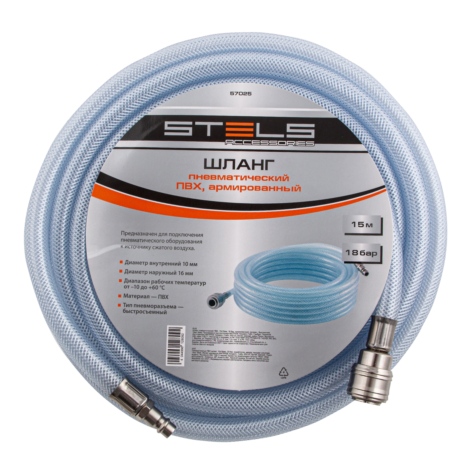 Шланг пневматический ПВХ, 10 x 16 мм, 18 бар, армированный, прозрачный, быстросъемное соединение, 15 м Stels в Челябинске