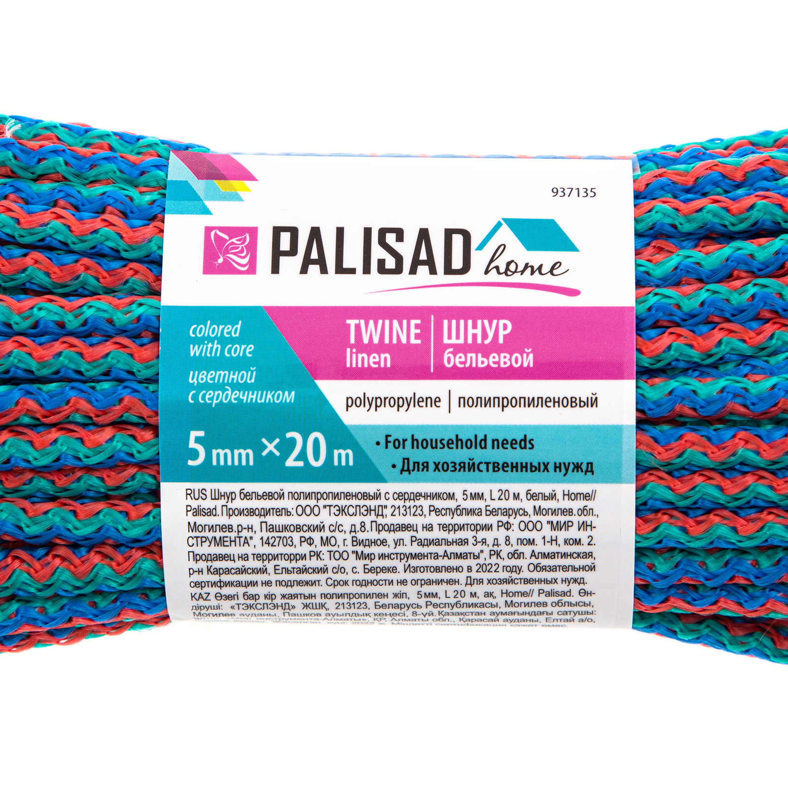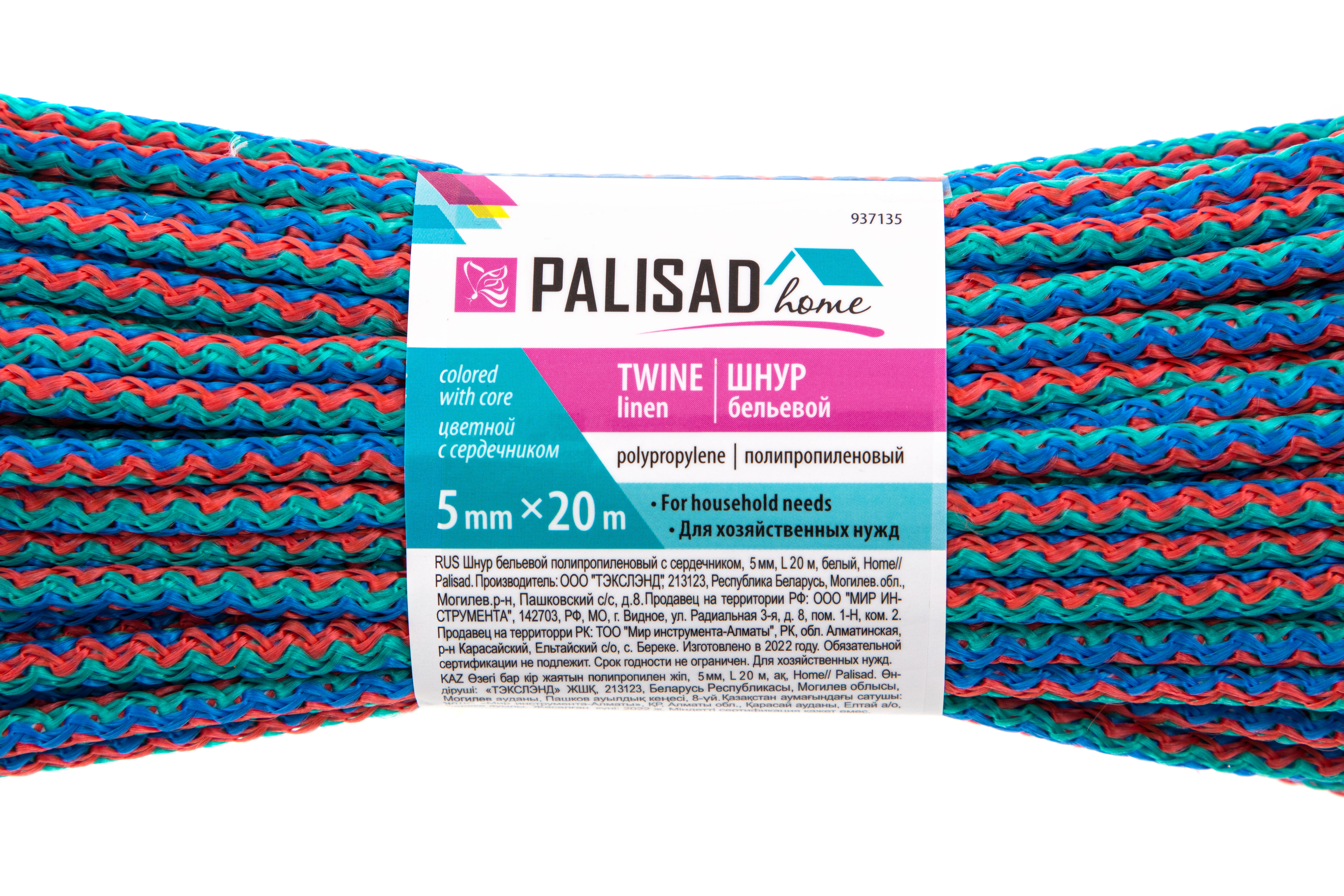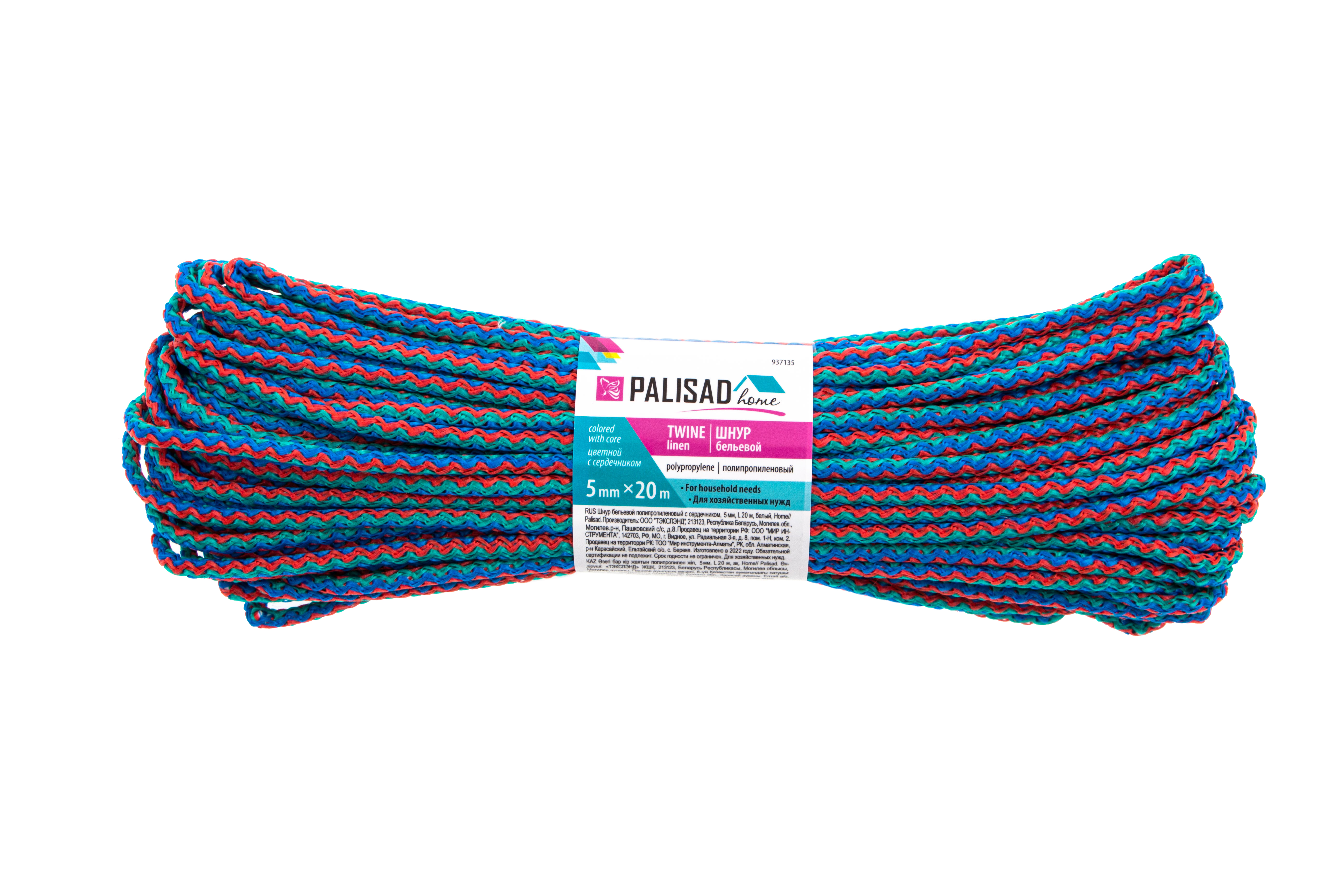 Шнур бельевой полипропиленовый с сердечником, 5 мм L 20 м, цветной, Home Palisad в Челябинске