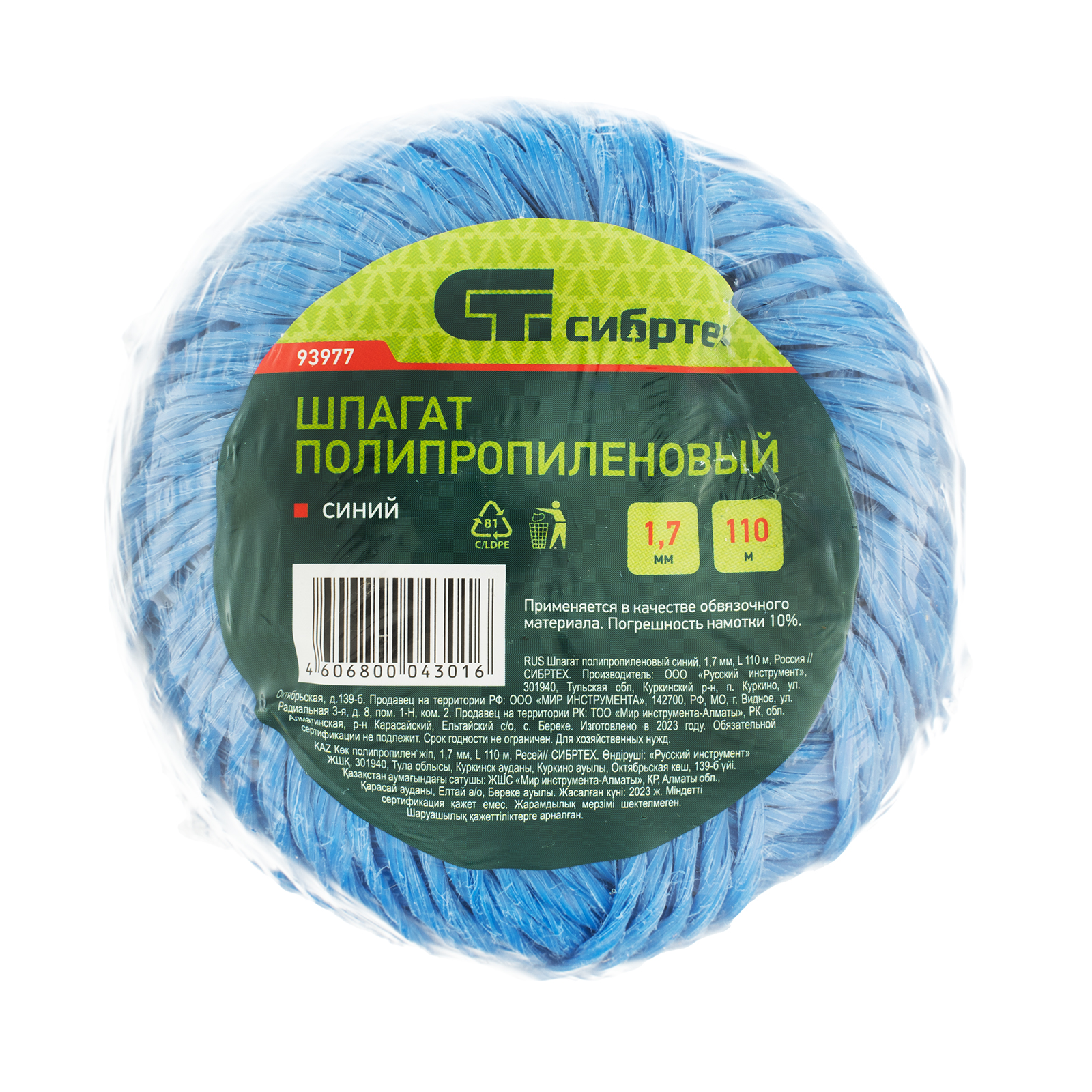 Шпагат полипропиленовый синий, 1.7 мм, L 110 м, Сибртех в Челябинске