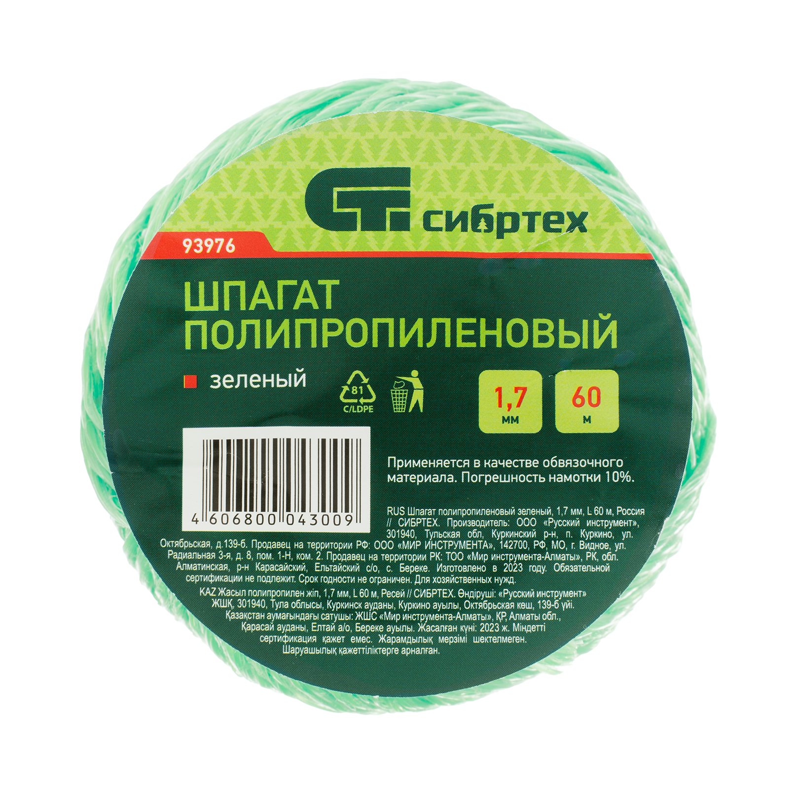 Шпагат полипропиленовый зеленый, 1.7 мм, L 60 м, Сибртех в Челябинске