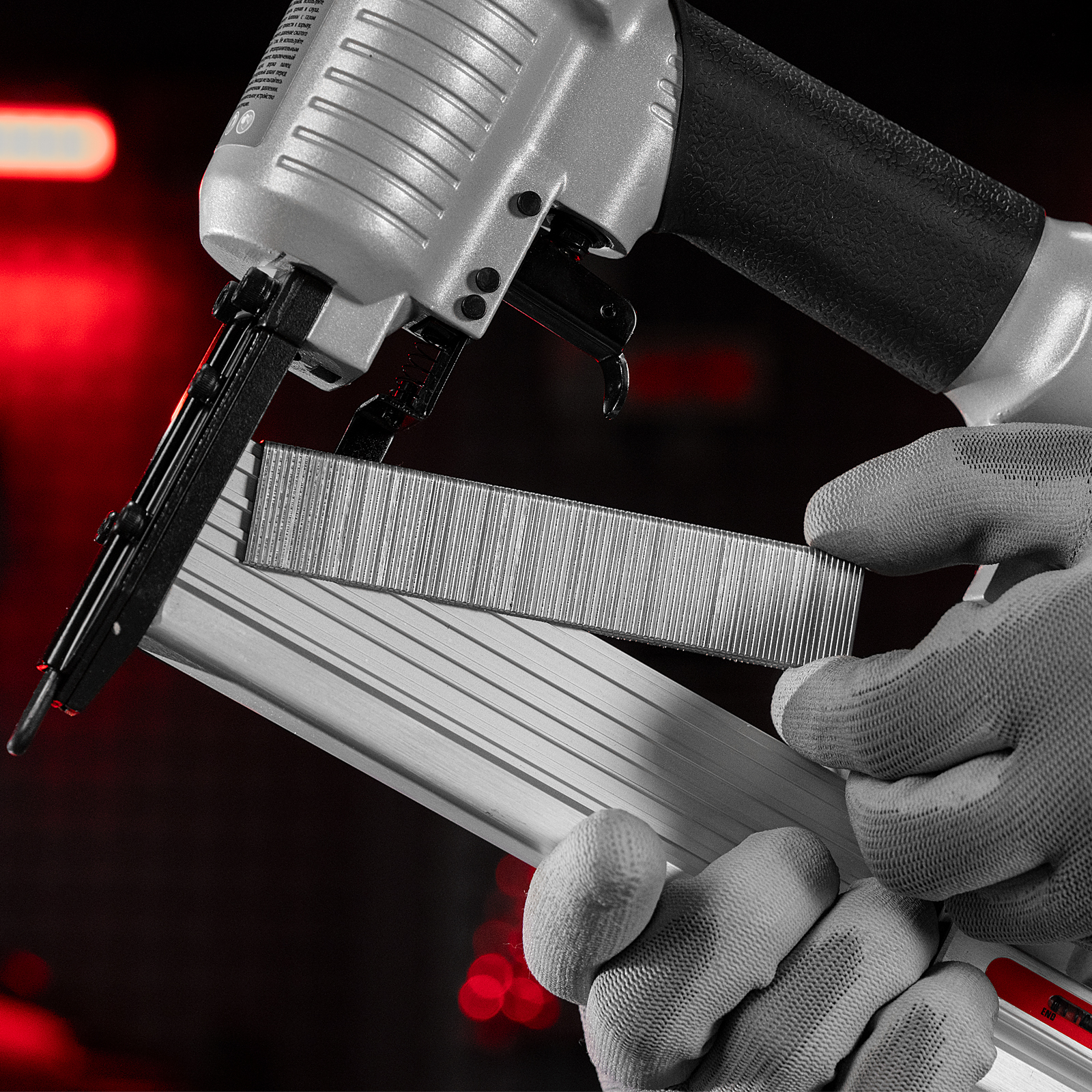 - Прочность и коррозионная стойкость — скобы изготовлены из стали твердостью 310 HV и имеют предел прочности при растяжении 1100 Н/мм², а никелевое покрытие защищает их от воздействия влаги.