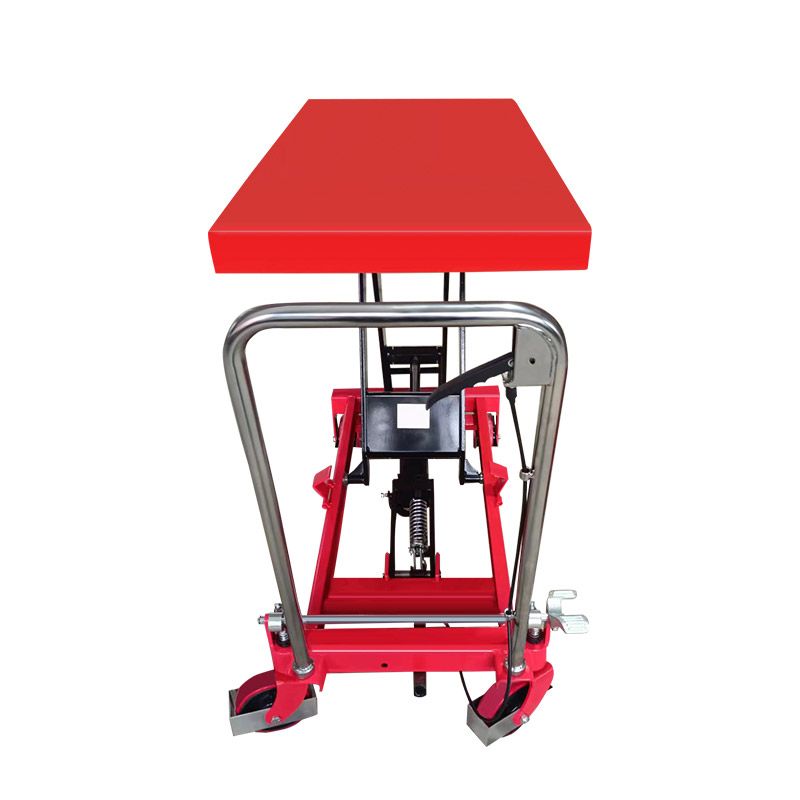Механизм подъема – одинарный ножничный посредством нажатия ногой на подъемный рычаг. Опускание осуществляется путем нажатия на себя управляющего рычага на ручке подъемного стола.