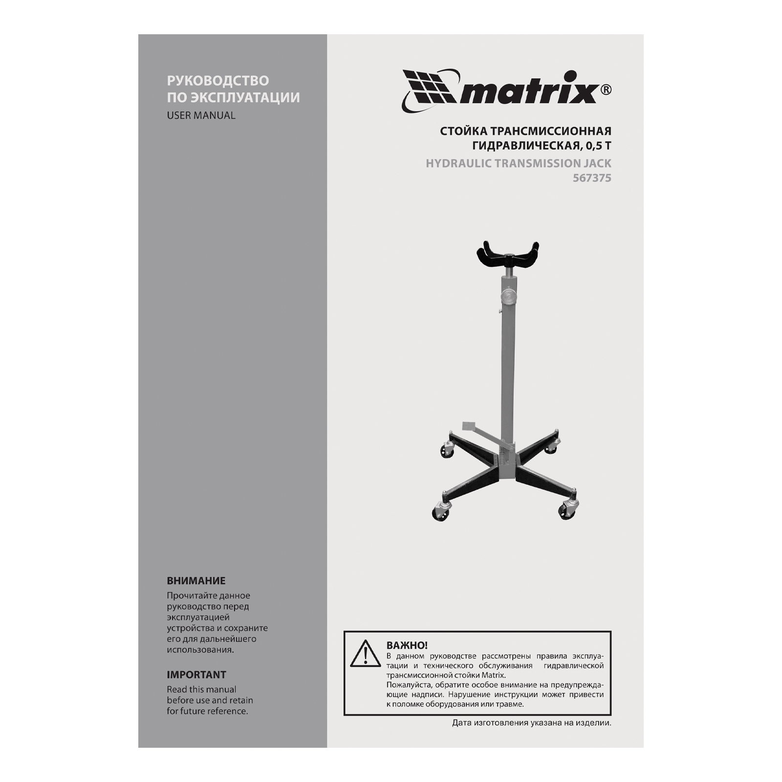 Стойка трансмиссионная гидравлическая, 0.5 т, H подъема 1130-1945 мм Matrix в Челябинске