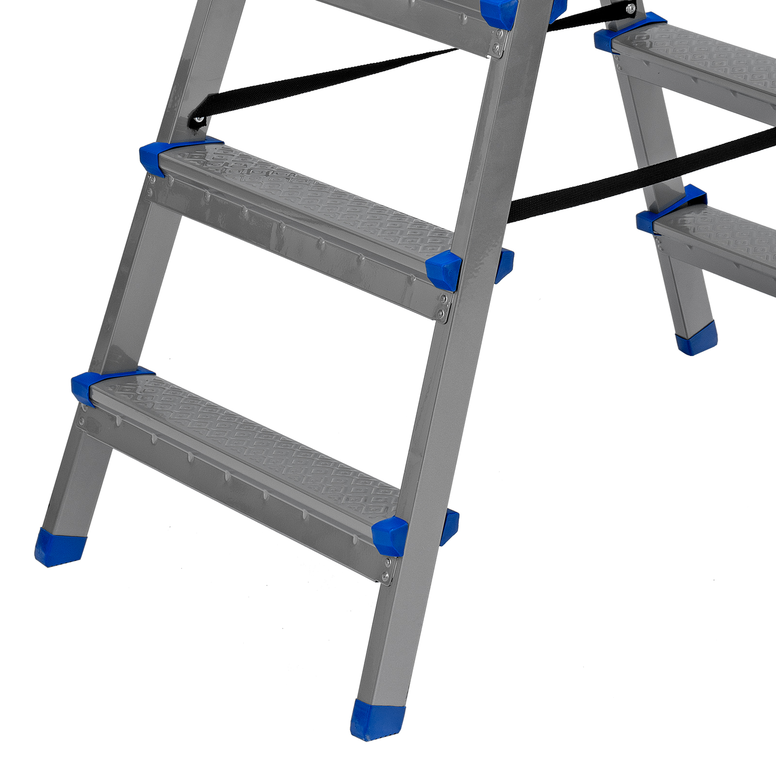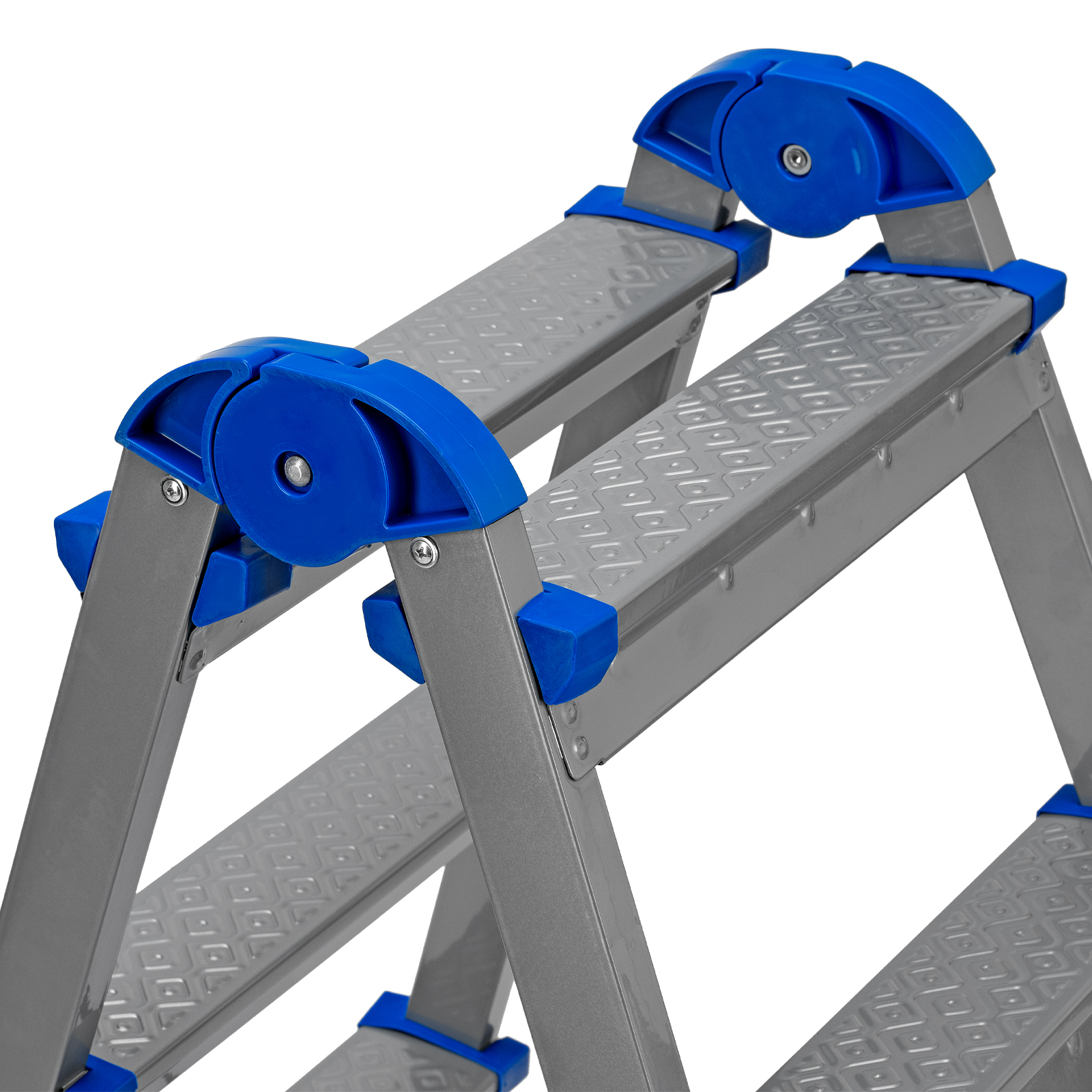Стремянка двухсторонняя Сибртех 97985 со стальным профилем и 5 стальными ступенями помогает решать бытовые задачи на высоте, превышающей человеческий рост. Ее используют, чтобы доставать предметы с антресолей или шкафов, проводить уборку, менять лампочки, вешать полки или картины. Работать с электроинструментом на ней не рекомендуется. Стремянка с пластиковым складным механизмом повышенной стабильности и широким основанием очень устойчива на ровной поверхности. Площадка находится на высоте 110 см от опорной поверхности, рабочая высота стремянки составляет 310 см (при среднем росте пользователя 170 см).