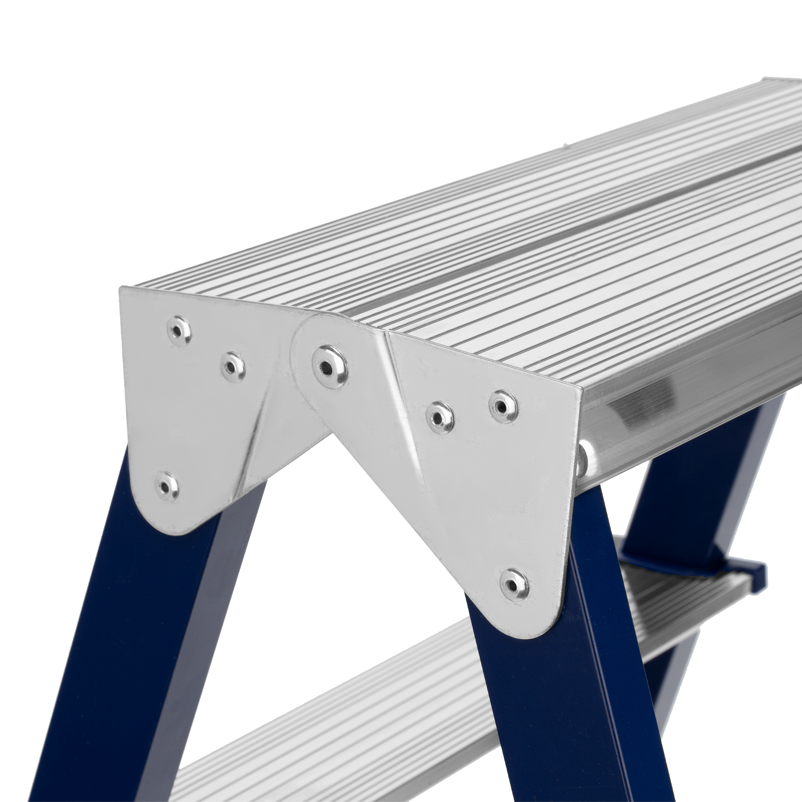 - Пластиковые заглушки на опорах — стремянка не скользит и не царапает напольное покрытие.