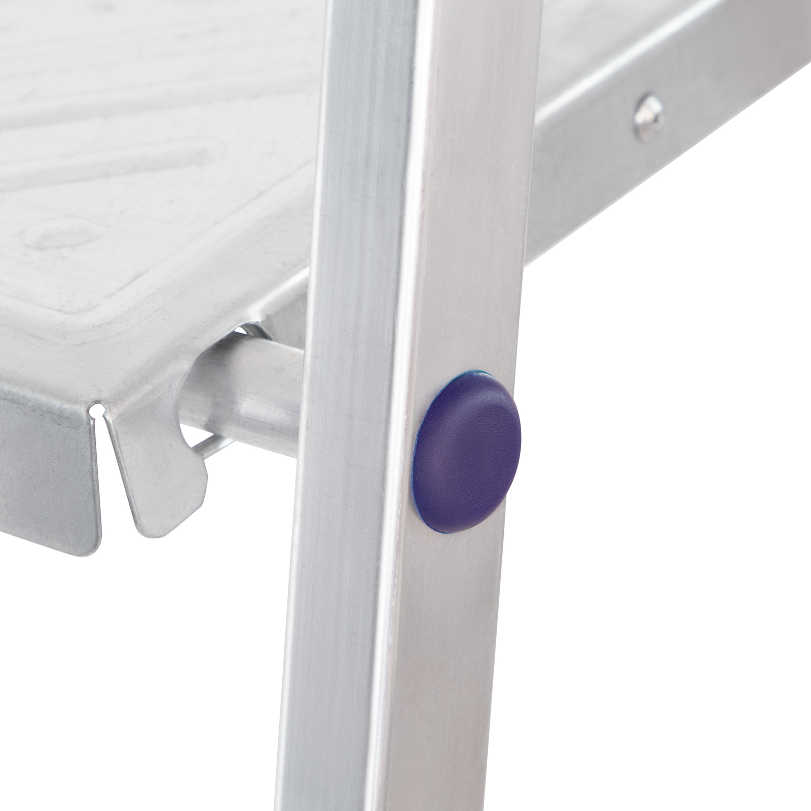 - Надежность — рама из прямоугольного алюминиевого профиля выдерживает нагрузку до 150 кг, широкие ступени закреплены заклепками.