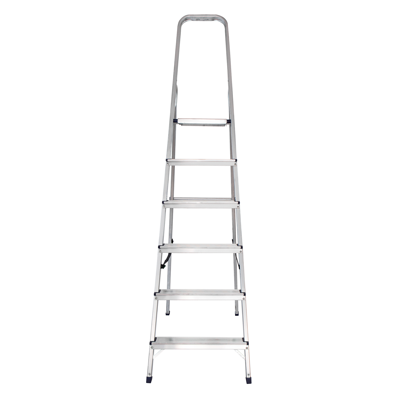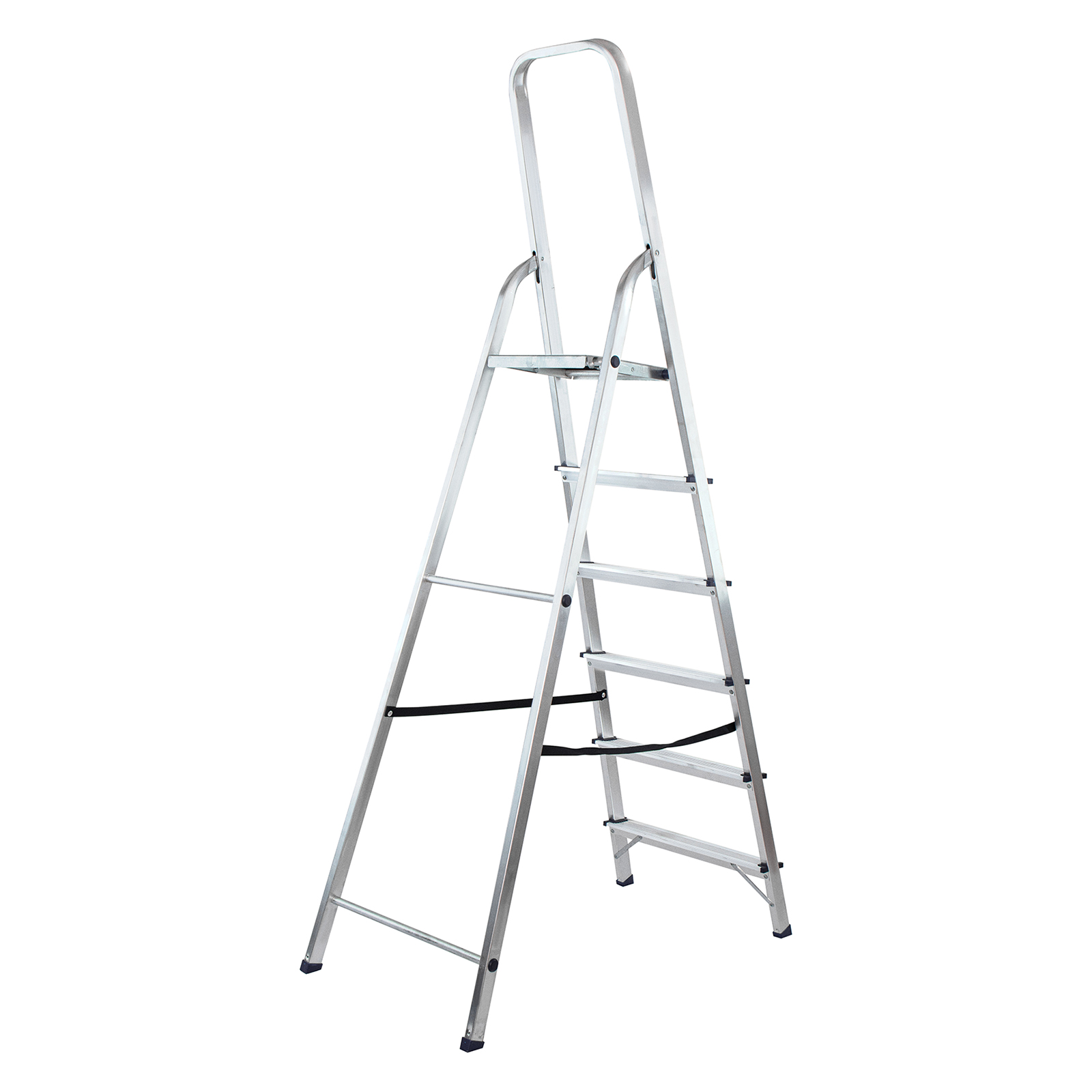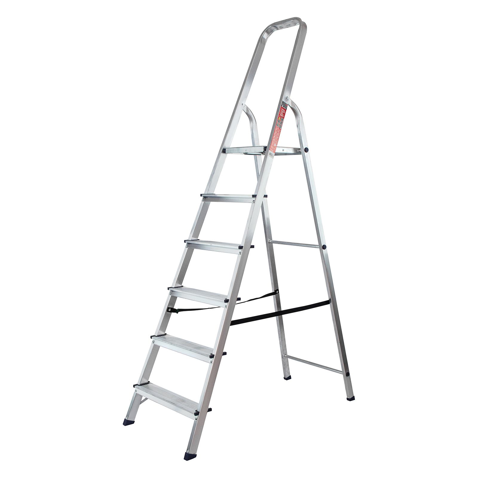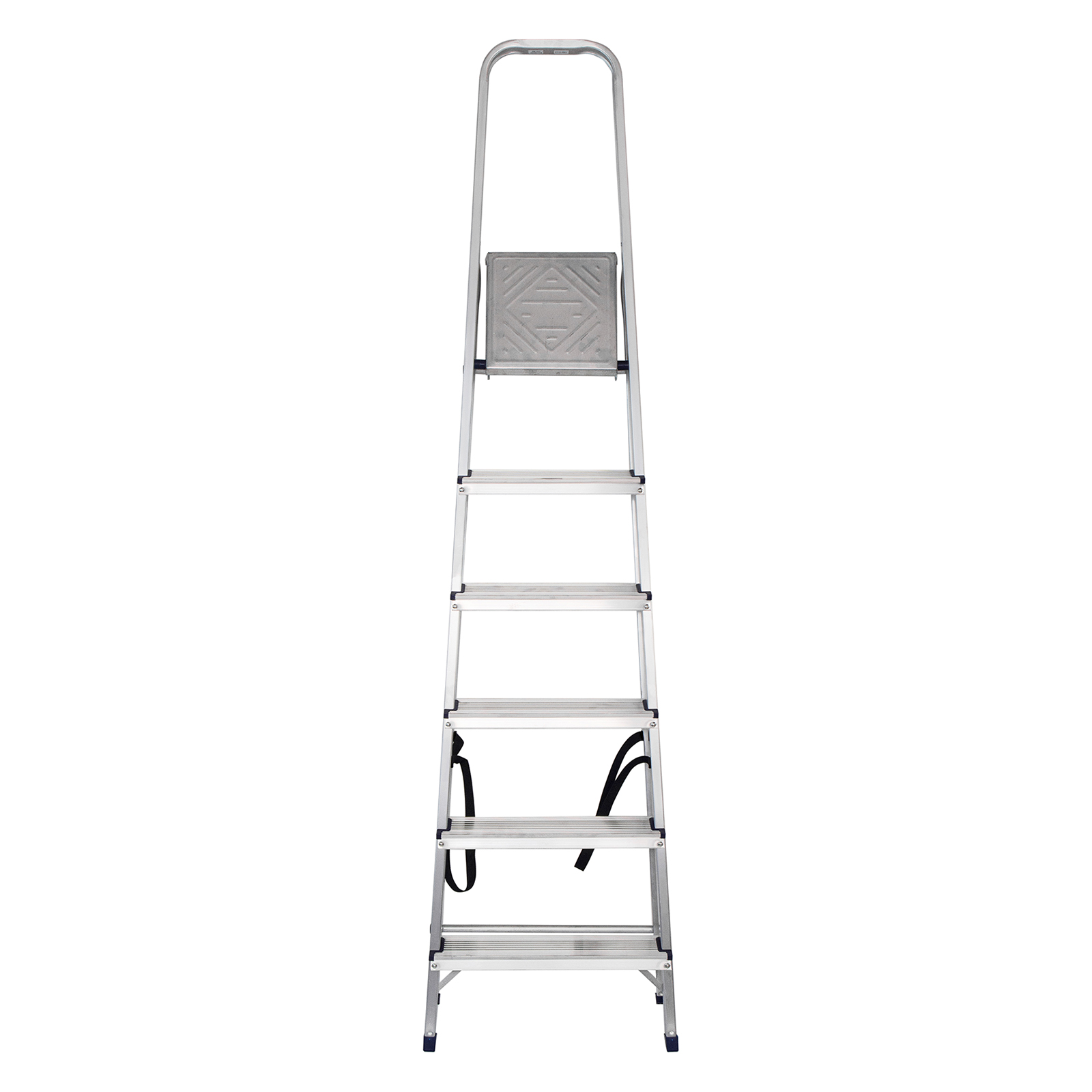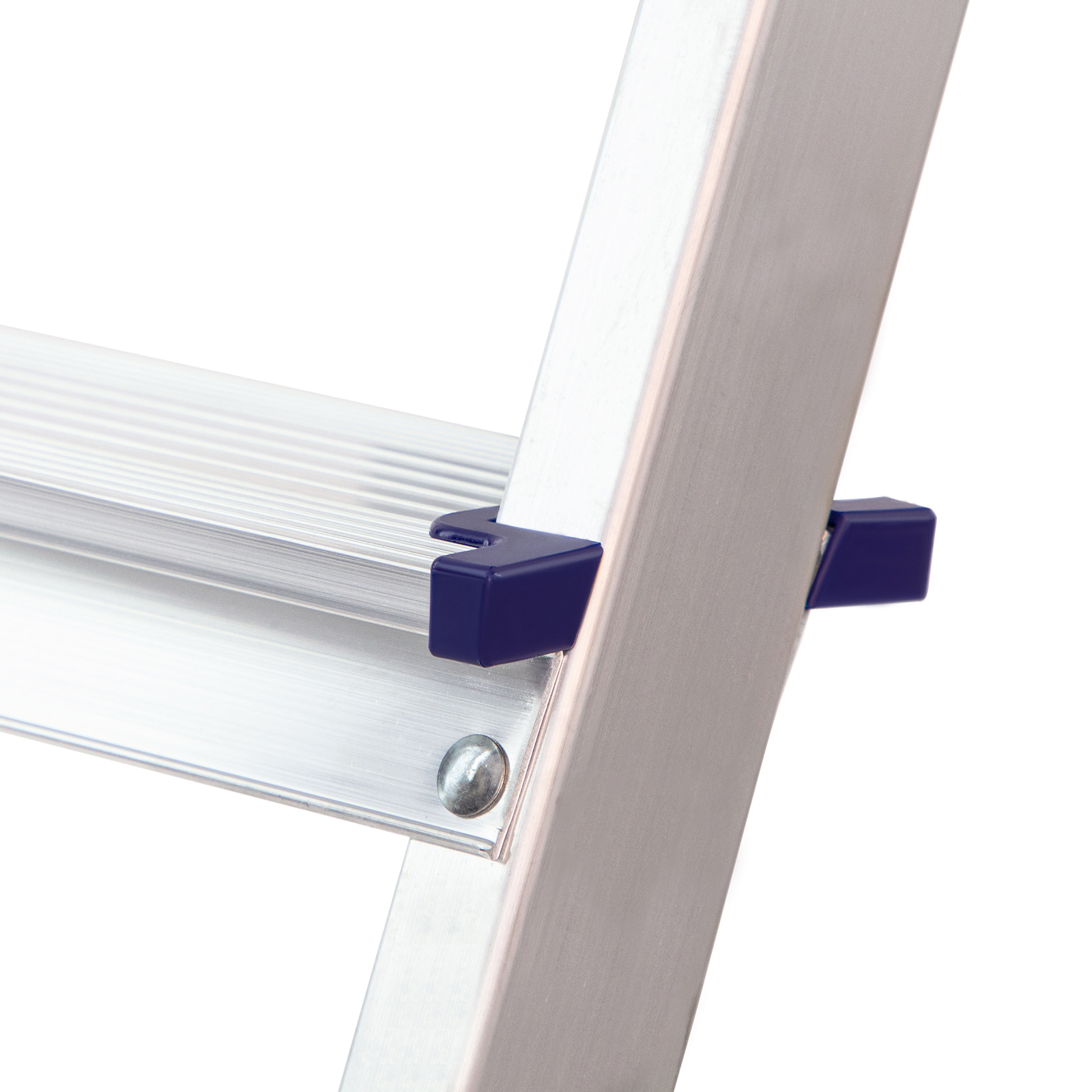 - Надежность — рама из прямоугольного алюминиевого профиля выдерживает нагрузку до 150 кг, широкие ступени закреплены заклепками, страховочные стяжки повышают прочность конструкции.