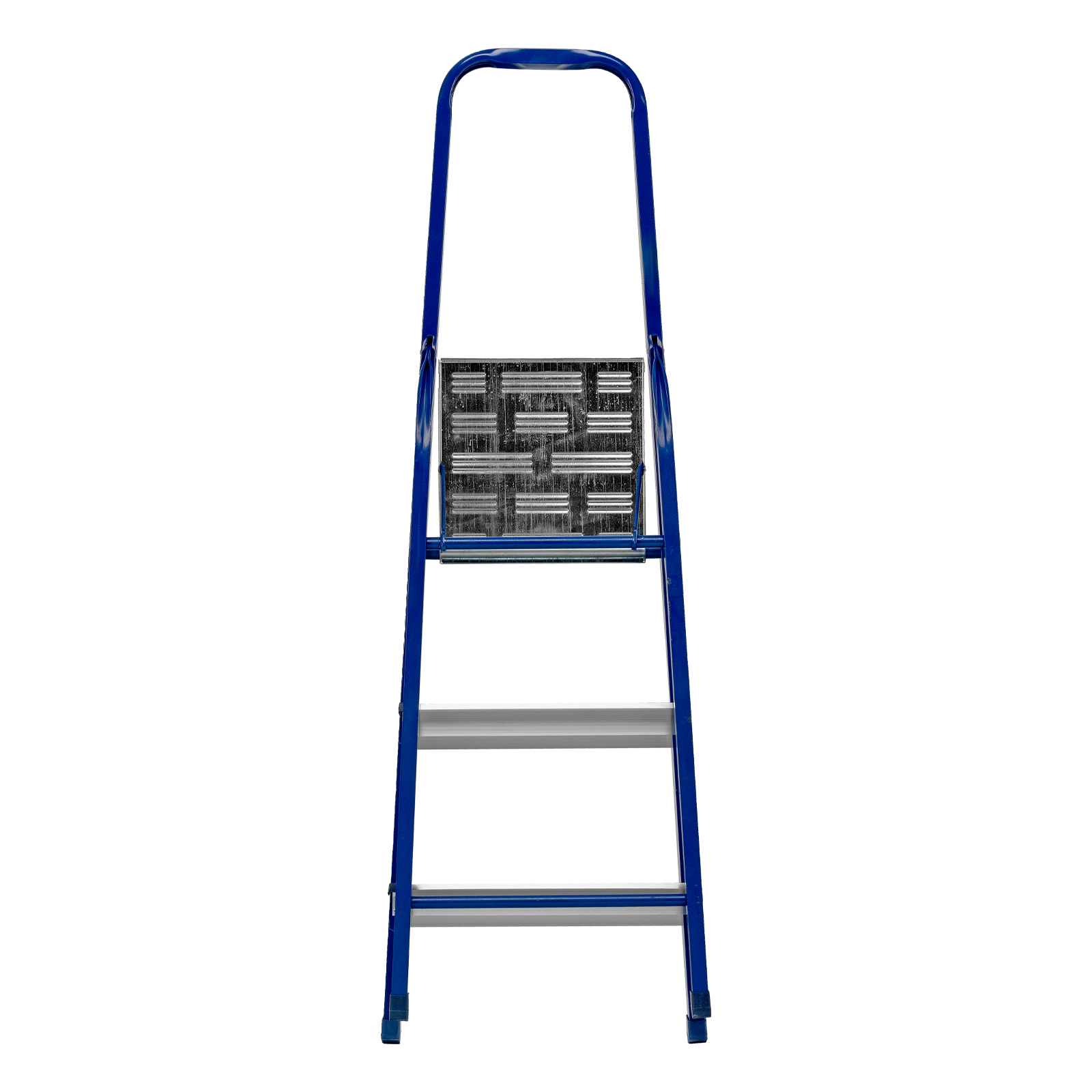 - Надежная конструкция — рама изготовлена из профилированной стали, стальная верхняя площадка с зацепами прочно фиксирует стремянку в рабочем положении.