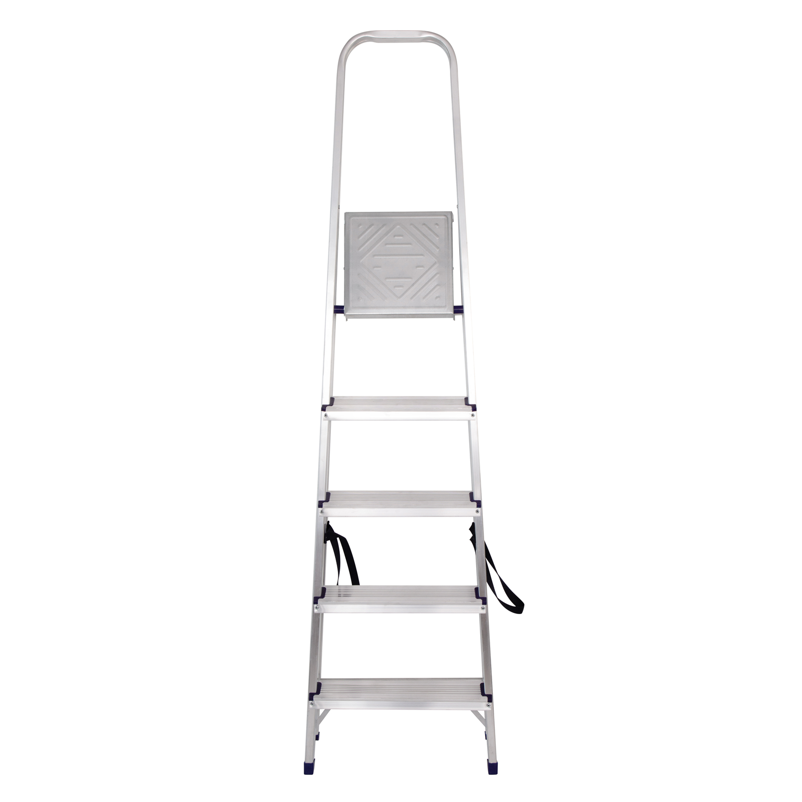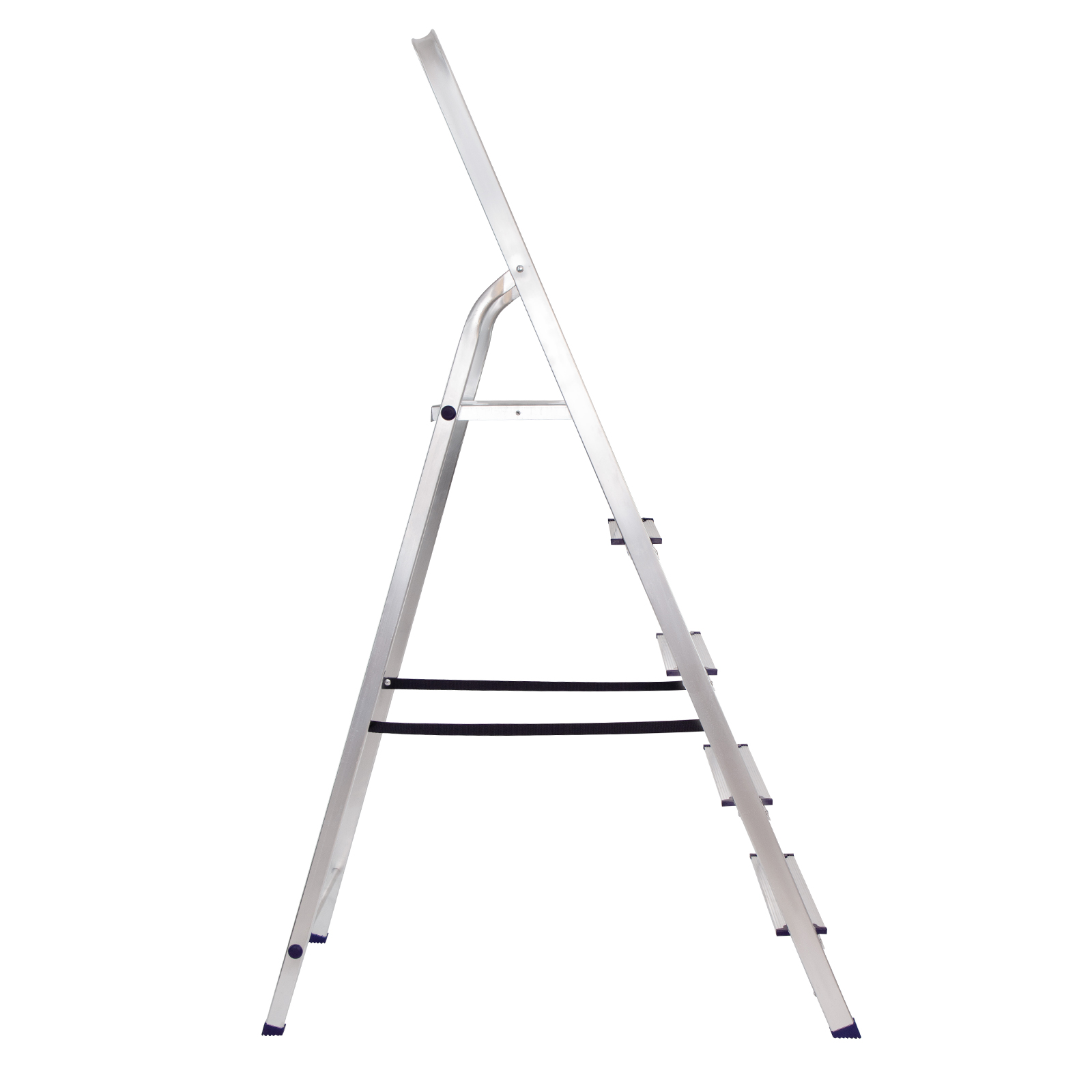 - Надежность — рама из прямоугольного алюминиевого профиля выдерживает нагрузку до 150 кг, широкие ступени закреплены заклепками, страховочные стяжки повышают прочность конструкции.